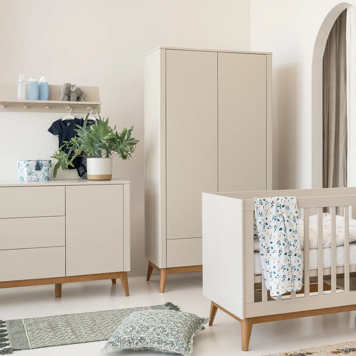 Szafa Pinio Seth 2-drzwiowa to funkcjonalny i stylowy mebel do pokoju dziecka, który łączy minimalistyczny design, wygodę codziennego użytkowania i ponadczasową estetykę. Dzięki subtelnemu szampańskiemu wybarwieniu, gładkim frontom oraz smukłym nóżkom z litego drewna bukowego szafa prezentuje się lekko i elegancko.