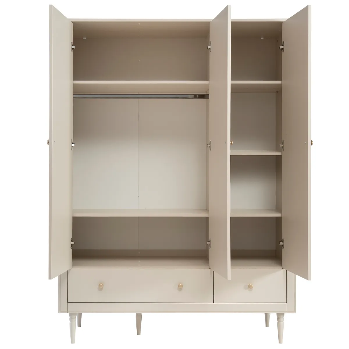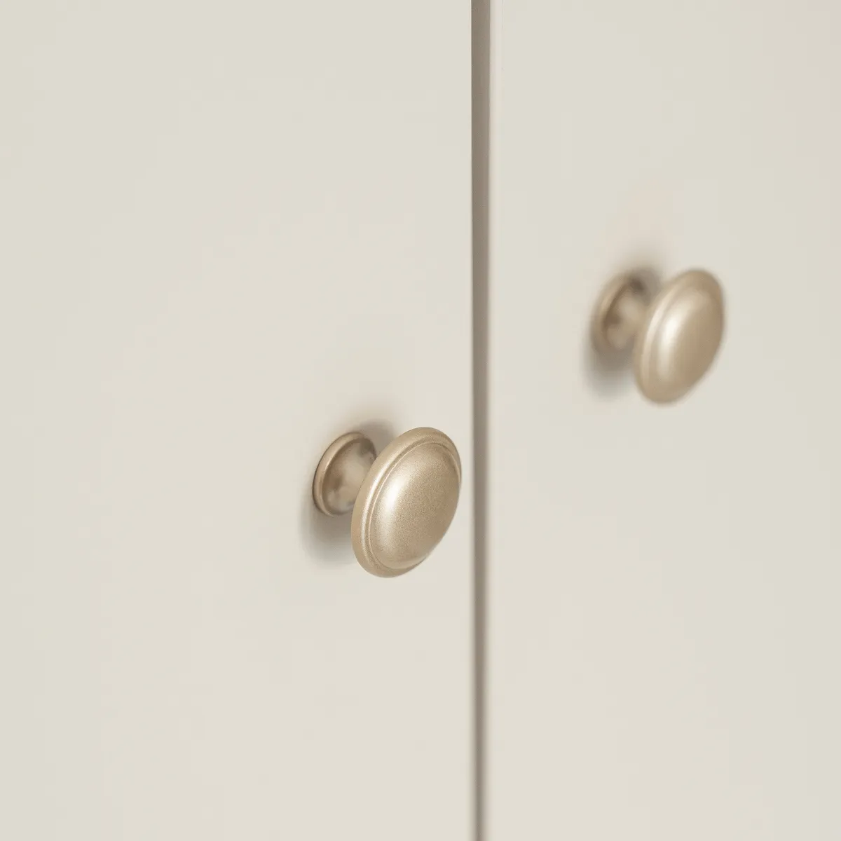 Złote uchwyty, lekkie bukowe nóżki i dopracowane proporcje sprawiają, że szafa idealnie wpisuje się w styl nowoczesny, japandi, skandynawski i klasyczny.