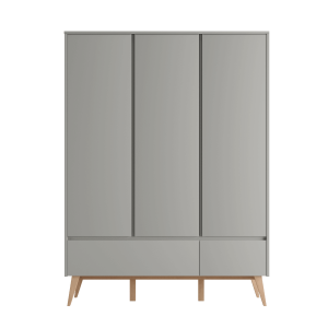 Neutralny odcień szarości i drewniane nóżki sprawiają, że szafa dobrze wygląda zarówno w pokoju niemowlaka, jak i starszego dziecka. Model świetnie komponuje się z innymi meblami z kolekcji PINIO SWING szare.