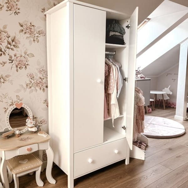 Szafa Collet została zaprojektowana z myślą o wygodzie użytkowania i porządku w codziennym życiu. Wewnątrz znajdziesz praktyczny drążek na wieszaki, półkę na złożone ubrania oraz dużą szufladę na drobiazgi, tekstylia czy zabawki. Funkcjonalny układ wnętrza sprawia, że przechowywanie staje się intuicyjne, a dziecko może łatwo zorganizować swoje rzeczy.