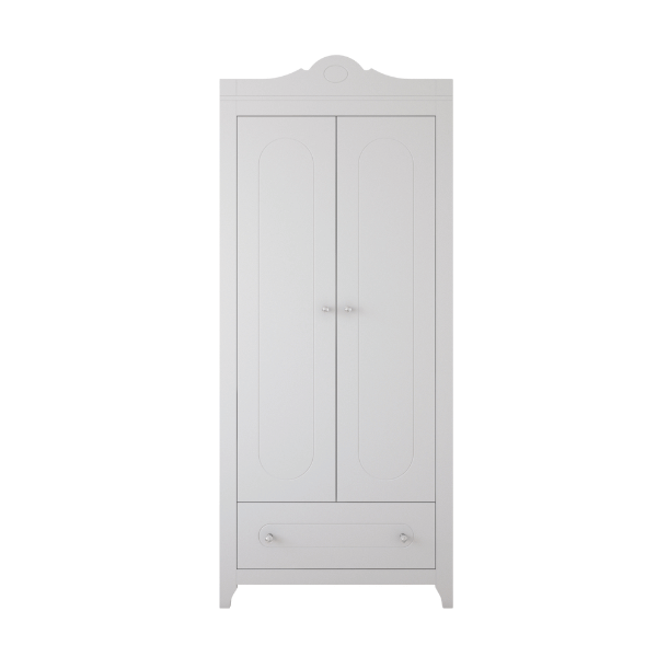 Szafa w kolorze klasycznej bieli to wyjątkowy element wyposażenia dziecięcego pokoju, który zachwyca nie tylko praktycznością, ale także wyjątkowym wyglądem. Jej designerski charakter podkreślają subtelne frezy na frontach oraz stylowe kryształowe uchwyty, które dodają jej szyku i lekkości.