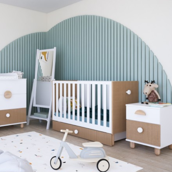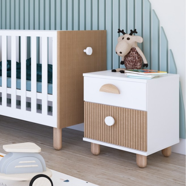 Szafka nocna z kolekcji Loft to stylowe i funkcjonalne uzupełnienie łóżka, idealne zarówno do pokoju dziecka, jak i nastolatka. Jej nowoczesny, a zarazem subtelny wygląd łączy elegancką biel z naturalnym drewnem na froncie jednej z dwóch szuflad, tworząc przytulny i ponadczasowy duet kolorystyczny. Całość dopełniają bukowe nogi i uchwyty, które nadają meblowi lekkości i naturalnego uroku. Dzięki temu szafka doskonale wpisuje się w różne style – od skandynawskiego po nowoczesny – i harmonijnie komponuje się z innymi elementami kolekcji Loft.