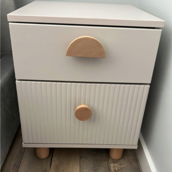 To szafka nocna do pokoju dziecka, która realnie poprawia codzienną wygodę. Dwie pojemne szuflady pozwalają schować książeczki, akcesoria, drobiazgi i wszystkie rzeczy, które warto mieć pod ręką przy łóżku.