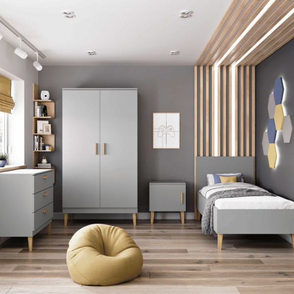 Łóżko dziecięce KUBI 180x80 w eleganckim kolorze szarym to praktyczny i stylowy wybór do każdego pokoju dziecięcego. Wykonane z trwałej, laminowanej płyty meblowej, zapewnia wysoką jakość i bezpieczeństwo użytkowania. Solidna konstrukcja, wzmocniona dodatkowymi łącznikami pod długimi płytami, sprawia, że łóżko wytrzymuje obciążenie do 100 kg, gwarantując trwałość na wiele lat. Dla większego bezpieczeństwa krawędzie łóżka zostały zaokrąglone, minimalizując ryzyko urazów. Podstawę stanowi rząd elastycznych listew spiętych wytrzymałymi pasami, które równomiernie rozkładają ciężar i zwiększają komfort użytkowania. Neutralny, szary kolor doskonale pasuje do każdej aranżacji wnętrza, nadając mu nowoczesny, a jednocześnie ponadczasowy charakter. Łóżko KUBI to doskonałe połączenie estetyki, funkcjonalności i solidności – idealne rozwiązanie zarówno dla młodszych, jak i starszych dzieci.