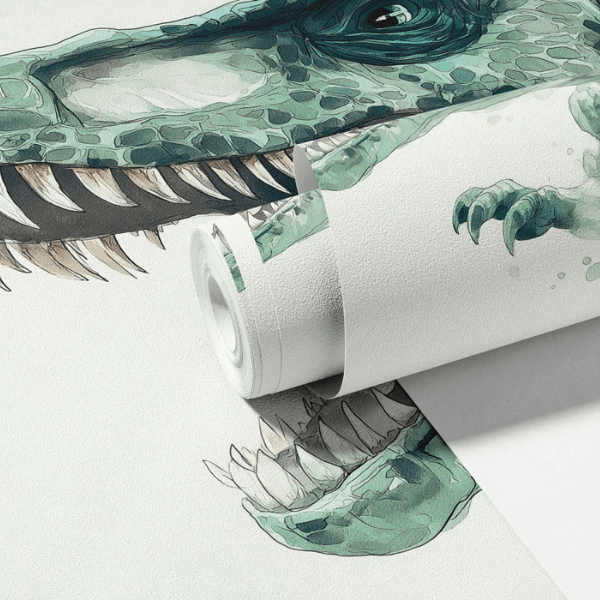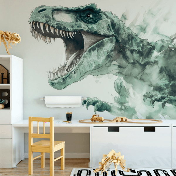 to wyjątkowa dekoracja ścienna, która w spektakularny sposób przenosi dziecięcy pokój w fascynujący świat prehistorii. Dynamiczna ilustracja przedstawiająca potężnego tyranozaura zachwyca detalem i artystycznym stylem, który łączy realizm z malarską lekkością. T-Rex wyłaniający się z subtelnych, zielonkawych smug wygląda, jakby był w ruchu, co nadaje całej kompozycji energii i głębi.