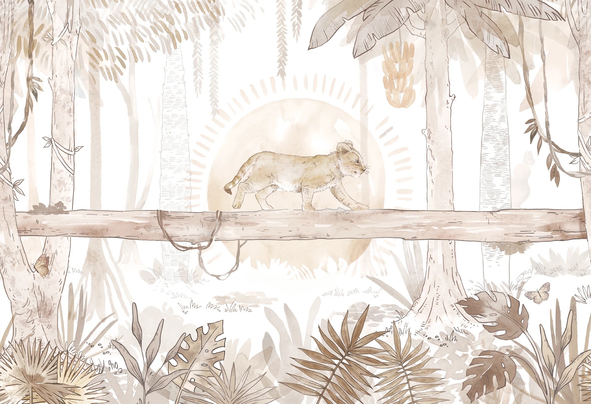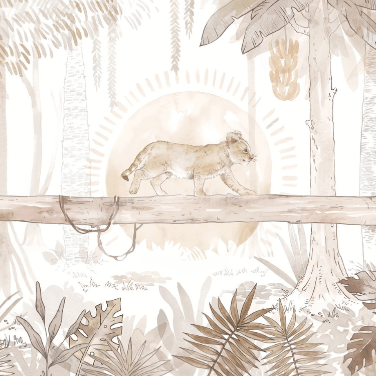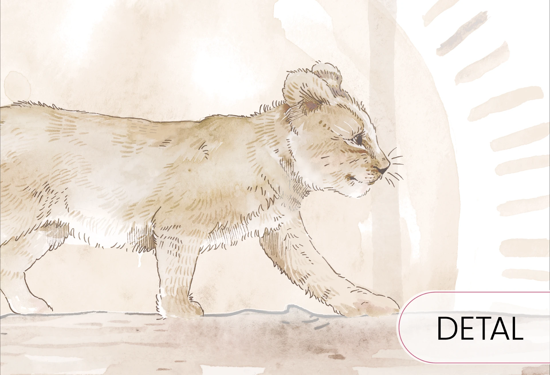 to wyjątkowa propozycja do pokoju niemowlęcego i dziecięcego, która przenosi wnętrze w spokojny, egzotyczny świat safari. Delikatna, akwarelowa ilustracja przedstawia rodzinę dzikich zwierząt w harmonijnym pochodzie: lwa z młodym, słonia, małpki, leniwca oraz barwne ptaki. Całość utrzymana jest w stonowanej, zielono-beżowej palecie kolorów, która sprzyja wyciszeniu i tworzy przyjazną, naturalną atmosferę.