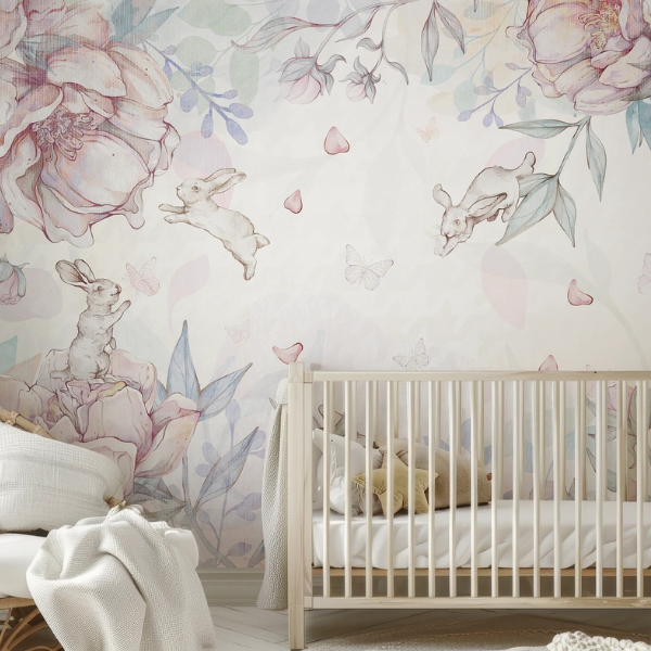 FLOWER BUNNIES - bubblegum - kwiatowa tapeta z króliczkami do pokoju dziewczynki