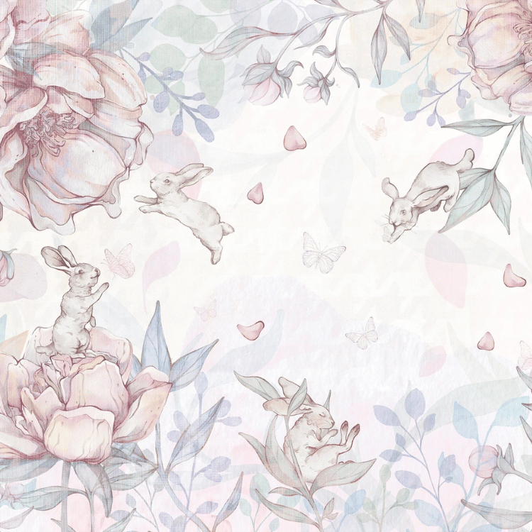 Tapeta Flower Bunnies guma balonowa to delikatna, pastelowa dekoracja ścienna pełna wdzięku i lekkości. Przedstawia urocze króliczki bawiące się wśród kwitnących piwonii, liści i motyli w tonacjach różu, błękitu i lawendy. Subtelne, akwarelowe barwy w stylu „bubble gum” wprowadzają do wnętrza świeżość, radość i bajkowy klimat. To idealny wybór do pokoju dziecka – tapeta, która rozweseli przestrzeń i pobudzi wyobraźnię najmłodszych.