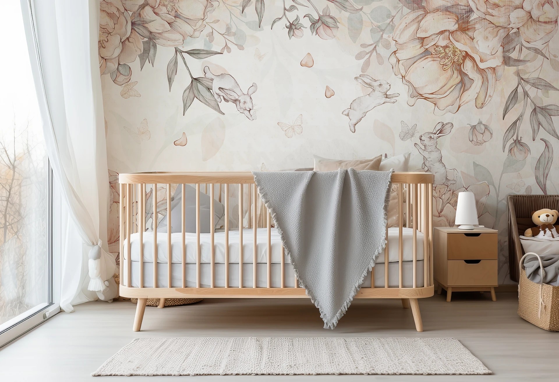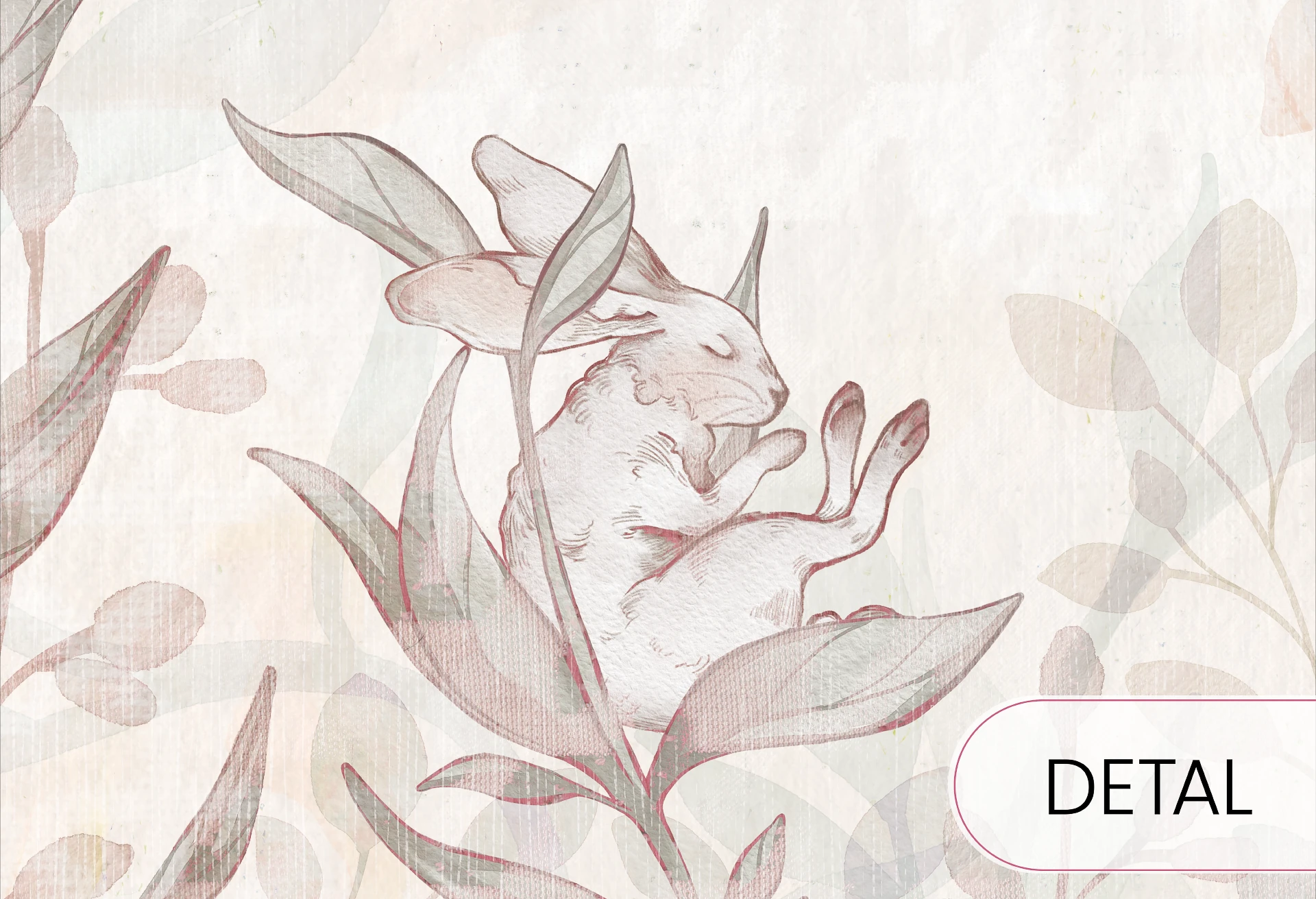 FLOWER BUNNIES - rose - kwiatowa tapeta z króliczkami do pokoju dziewczynki