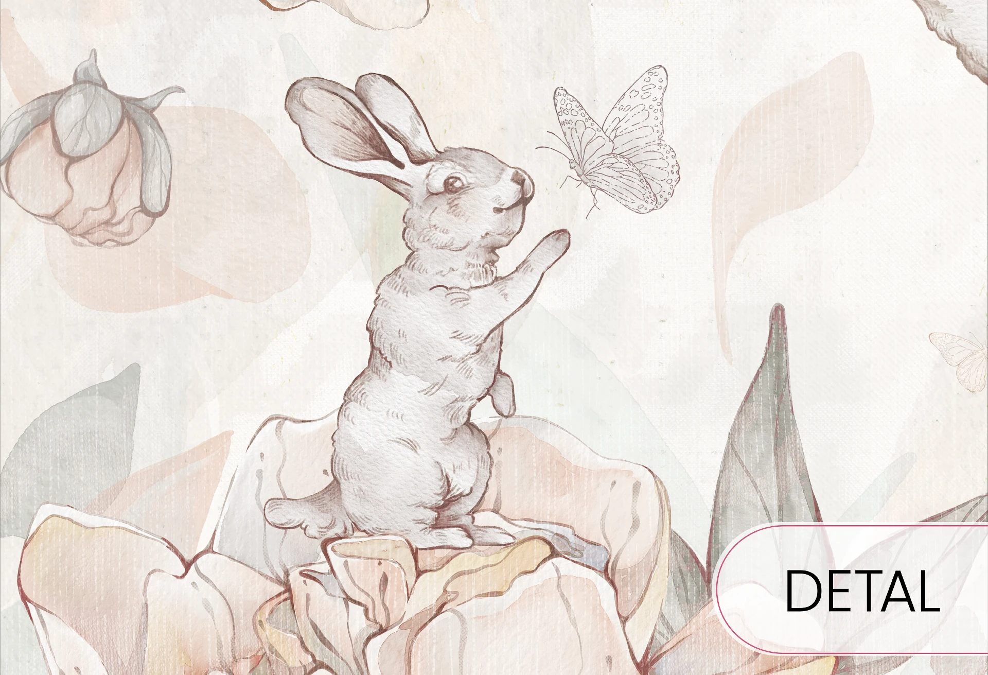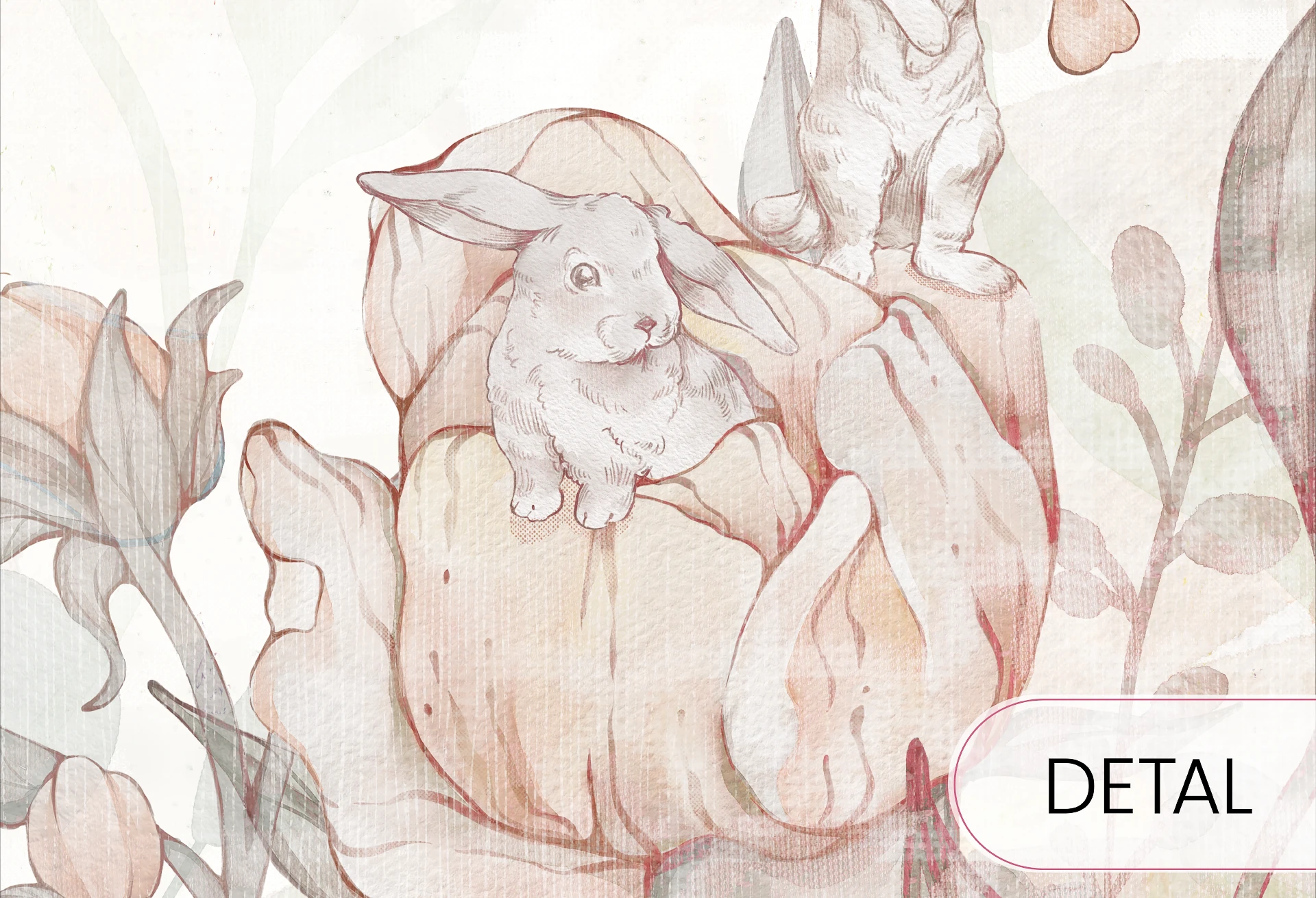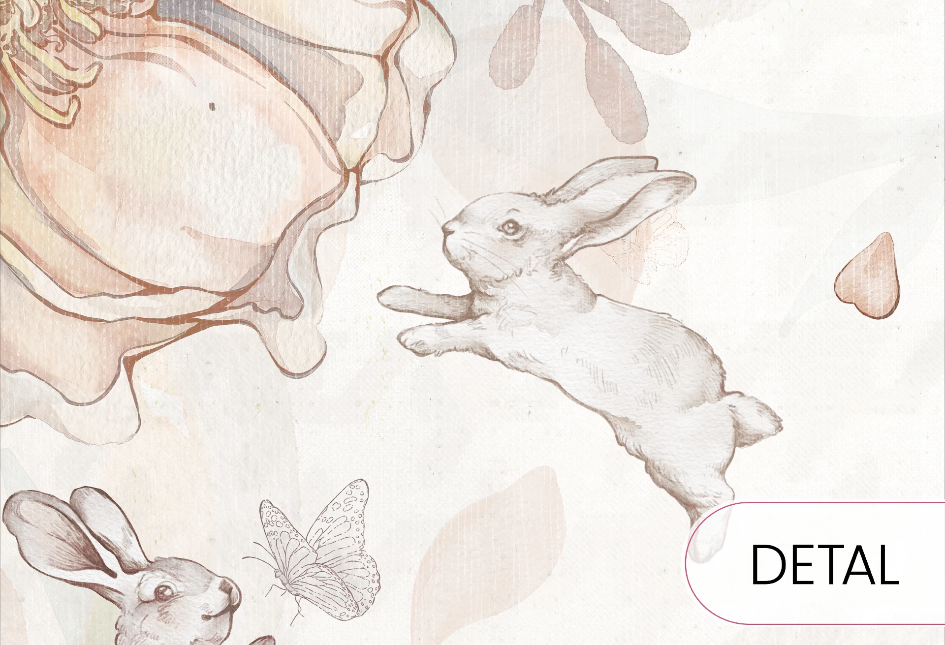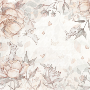 Tapeta Flower Bunnies w odcieniach rose to niezwykle urocza propozycja do pokoju dziecka, łącząca subtelne pastelowe barwy z delikatnymi akwarelowymi ilustracjami. Przedstawia radosne króliczki bawiące się wśród kwitnących piwonii i unoszących się płatków kwiatów, tworząc spokojny i ciepły nastrój. Utrzymana w tonacji pudrowego różu, beżu i kremu wprowadza do wnętrza harmonię i lekkość. To idealny wybór dla małej dziewczynki – tapeta, która nada wnętrzu bajkowego uroku i naturalnego piękna.