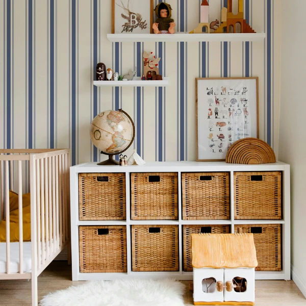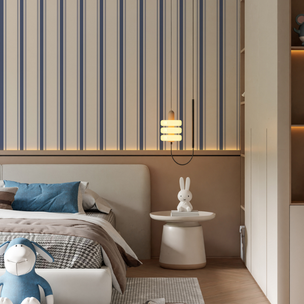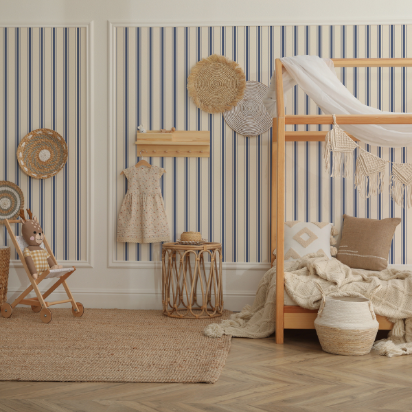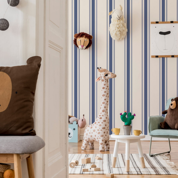 w stylu vintage to ponadczasowa propozycja do pokoju dziecka lub nastolatka, która łączy klasyczną elegancję z przytulnym, domowym charakterem. Regularne, pionowe pasy w stonowanych odcieniach granatu i złamanej bieli wprowadzają do wnętrza harmonię oraz optycznie podwyższają pomieszczenie, nadając mu lekkości i ładu. Subtelna kolorystyka sprawia, że tapeta nie przytłacza aranżacji, a jednocześnie stanowi stylowe i uniwersalne tło do codziennych aktywności, nauki oraz odpoczynku. Wzór inspirowany estetyką vintage nawiązuje do klasycznych wnętrz, dzięki czemu doskonale sprawdzi się zarówno w pokoju młodszego dziecka, jak i nastolatka.