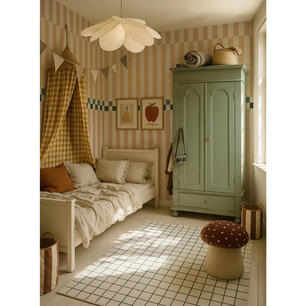 Tapeta świetnie sprawdzi się w pokoju dziewczynki, ale także w przestrzeniach wspólnych – kąciku zabaw czy pokoju rodzeństwa. Doskonale łączy się z naturalnym drewnem, jasnymi tkaninami, wikliną i dodatkami w kolorach ecru, beżu czy karmelu. Jest wdzięcznym tłem zarówno dla prostych mebli, jak i bardziej dekoracyjnych akcentów.