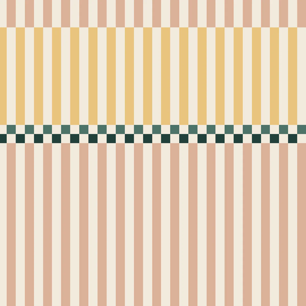 Bazę wzoru tworzą bardzo jasny, ciepły róż oraz słoneczny, delikatny żółty. To odcienie „rozbielone”, spokojne, dalekie od pstrokatych barw, dzięki czemu tapeta nie dominuje wnętrza. Kolory przełamane są charakterystycznym, dekoracyjnym pasem, który nadaje całości rytm i lekko retro charakter. Całość wygląda świeżo, lekko i harmonijnie – dokładnie tak, jak na naszych wizualizacjach.