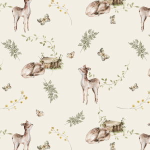 Tapeta Jelenie to subtelna, akwarelowa kompozycja inspirowana spokojem leśnej przyrody. Na jasnym, kremowym tle pojawiają się delikatnie malowane jelonki – stojące i odpoczywające – otoczone gałązkami, liśćmi, drobnymi kwiatami oraz motylami. Całość utrzymana jest w naturalnej, stonowanej palecie barw: beżach, brązach i zieleni, które wprowadzają do wnętrza harmonię i ciepło. Wzór jest lekki i przestrzenny, dzięki czemu nie przytłacza pomieszczenia, a jednocześnie tworzy bajkowy klimat sprzyjający wyciszeniu. Tapeta doskonale sprawdzi się w pokoju dziecka, szczególnie w aranżacjach inspirowanych naturą, stylem leśnym lub boho. Motyw jeleni pobudza wyobraźnię i zachęca do opowieści o lesie oraz jego mieszkańcach. To idealny wybór dla rodziców szukających dekoracji eleganckiej, ponadczasowej i przyjaznej dzieciom. Wnętrze zyskuje dzięki niej spokojny, ciepły charakter.