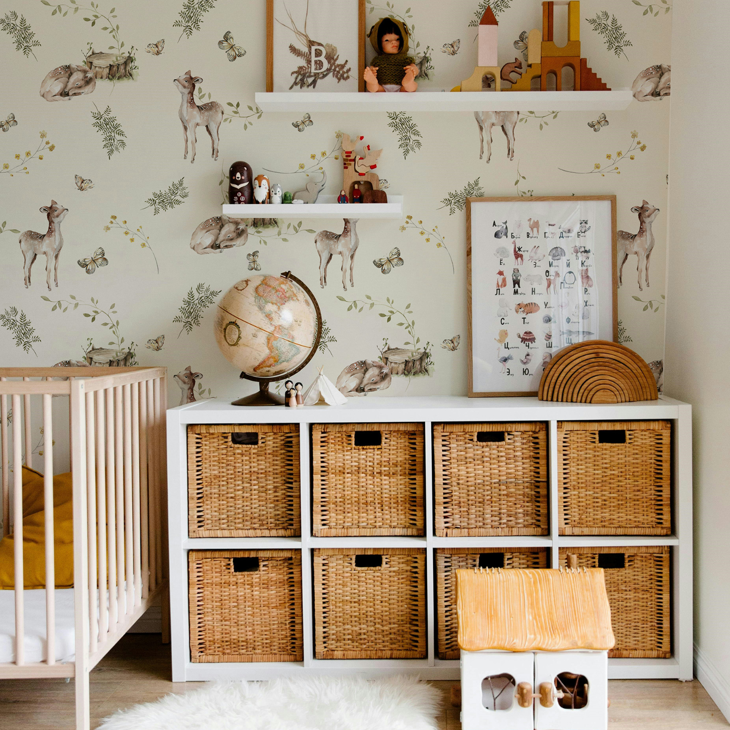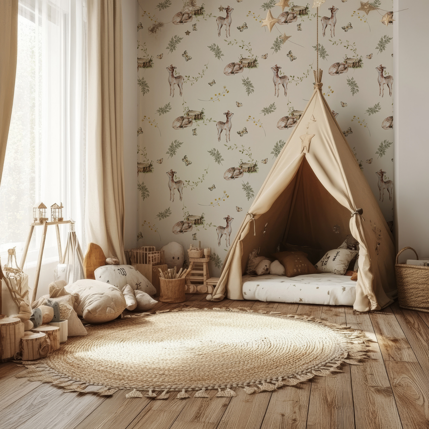 Tapeta świetnie komponuje się z drewnianymi meblami oraz dodatkami w naturalnych kolorach. Jej uniwersalny wzór pasuje zarówno do pokoju niemowlęcego, jak i starszego dziecka. Delikatne ilustracje wprowadzają atmosferę bliskości natury i bezpieczeństwa. To dekoracja, która rośnie razem z dzieckiem i długo pozostaje aktualna.