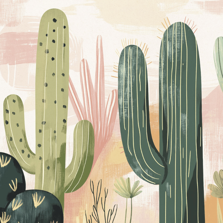 Motyw kaktusów symbolizuje siłę natury, wytrwałość i piękno ukryte w prostocie. Dzięki temu tapeta doskonale sprawdzi się w aranżacjach, które mają inspirować, wyciszać i pobudzać wyobraźnię. To idealny wybór do pokoju dziecka, pokoju młodzieżowego, sypialni lub przestrzeni kreatywnej, gdzie ważna jest lekkość i pozytywna energia. Kompozycja jest na tyle uniwersalna, że pasuje zarówno do wnętrz nowoczesnych, boho, jak i skandynawskich.