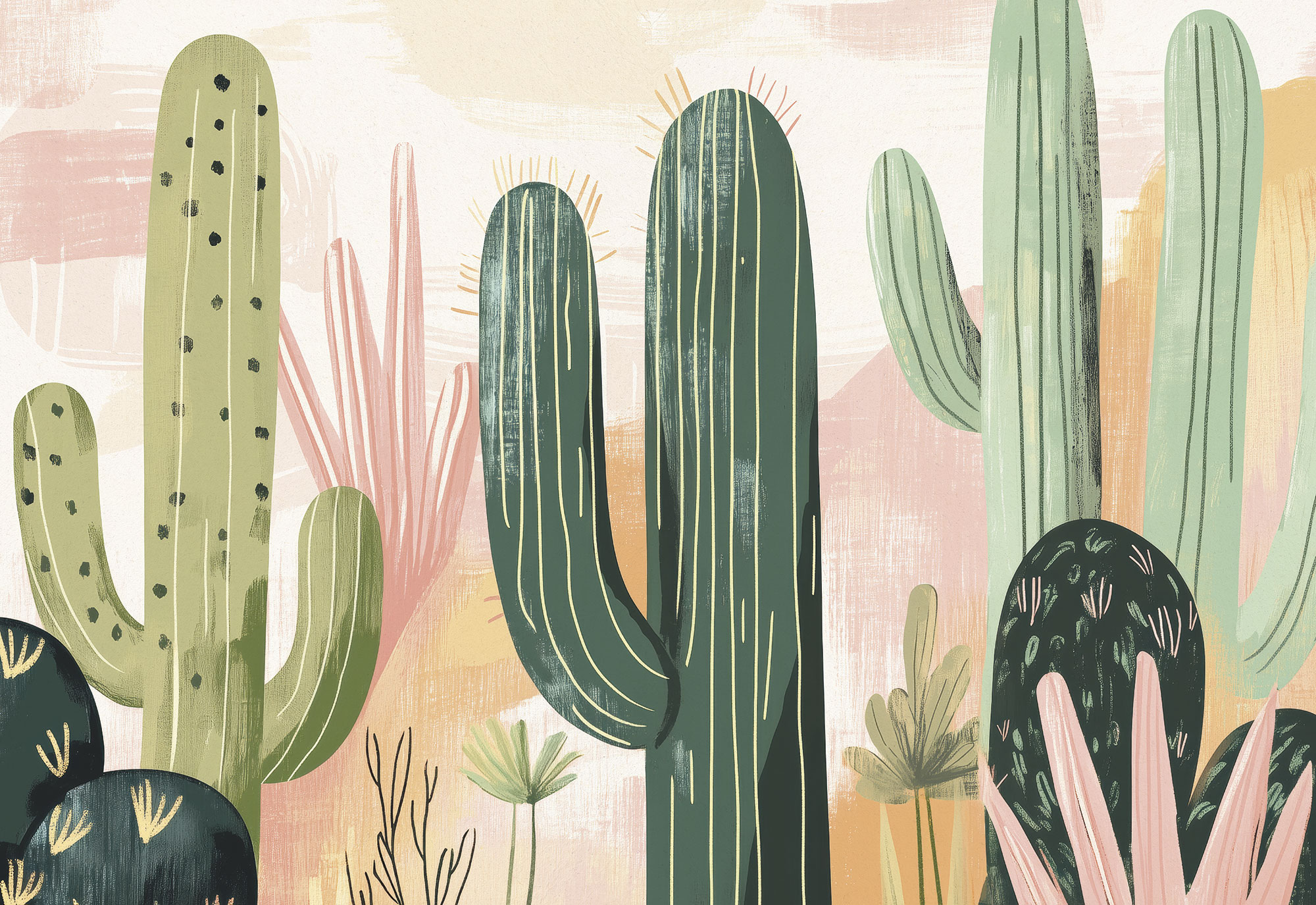 przedstawia niezwykły, stylizowany krajobraz pustyni skąpanej w ciepłym, miękkim świetle. Kompozycja oparta na różnorodnych formach kaktusów tworzy harmonijną, a jednocześnie dynamiczną scenę, która przyciąga wzrok i wprowadza do wnętrza wyjątkowy klimat. Subtelne przejścia kolorystyczne, pastelowe odcienie zieleni, beżu, różu i złamanej bieli budują niemal nierealną atmosferę spokoju i przestrzeni. Delikatna faktura ilustracji nadaje tapecie artystyczny charakter, przypominający ręcznie malowaną grafikę.