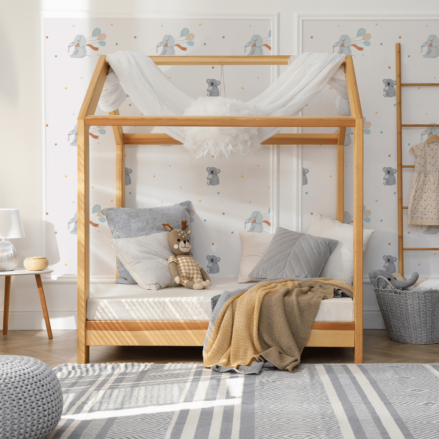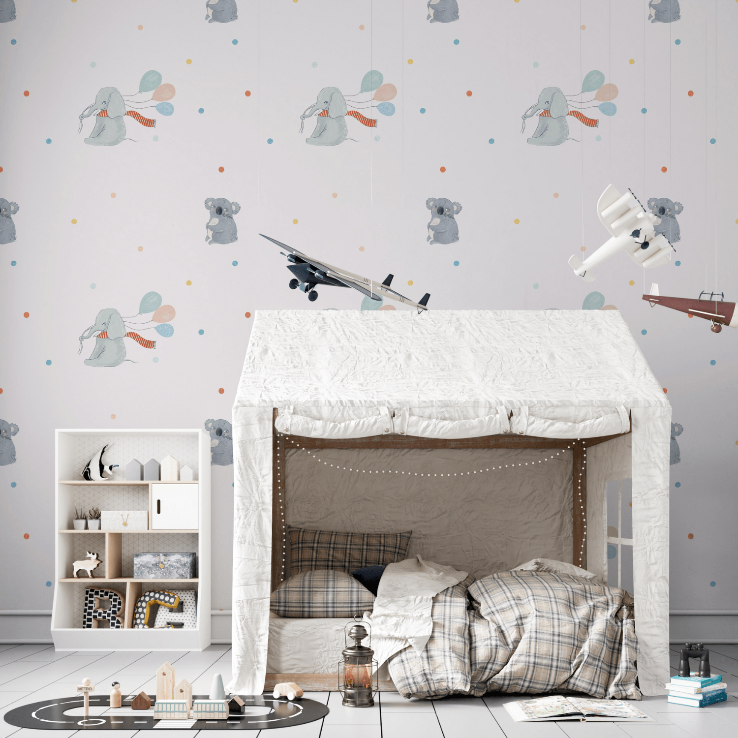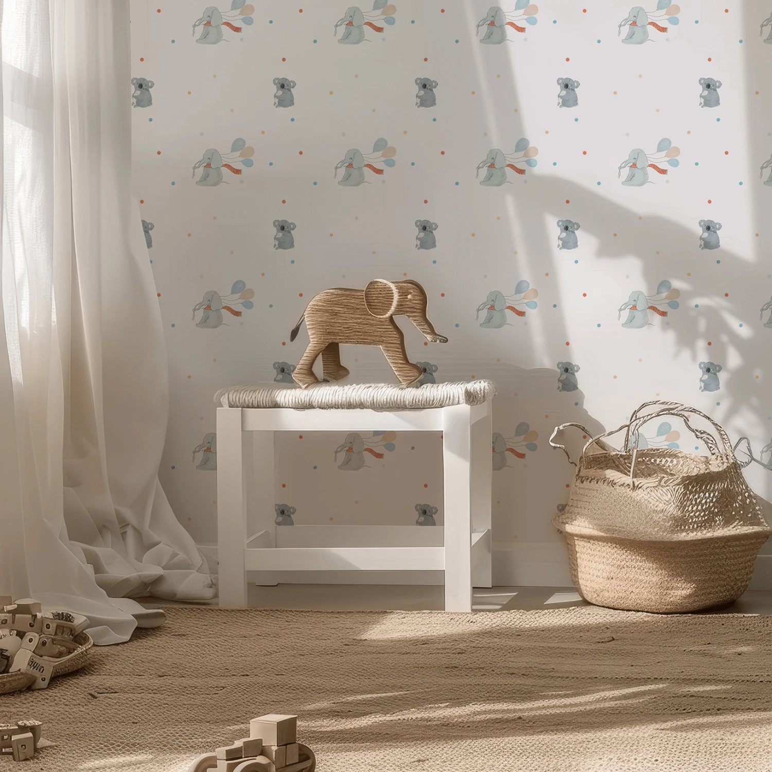 Ta urocza tapeta do pokoju chłopca zachwyca delikatnym, dziecięcym wzorem ze słonikami i koalą, tworząc przyjazną, pełną ciepła atmosferę idealną do kącika niemowlaka. Pastelowe kolory, miękkie linie i subtelne detale sprawiają, że dekoracja nie przytłacza wnętrza, a jedynie je dopełnia, wprowadzając spokój, radość i poczucie bezpieczeństwa. Słoniki z balonikami oraz sympatyczna koala rozwijają wyobraźnię, towarzysząc maluszkowi w codziennych chwilach – od zabawy po drzemkę. Tapeta świetnie komponuje się z jasnymi meblami, naturalnym drewnem i dodatkami w stylu skandynawskim, nadając przestrzeni lekkości i harmonii.