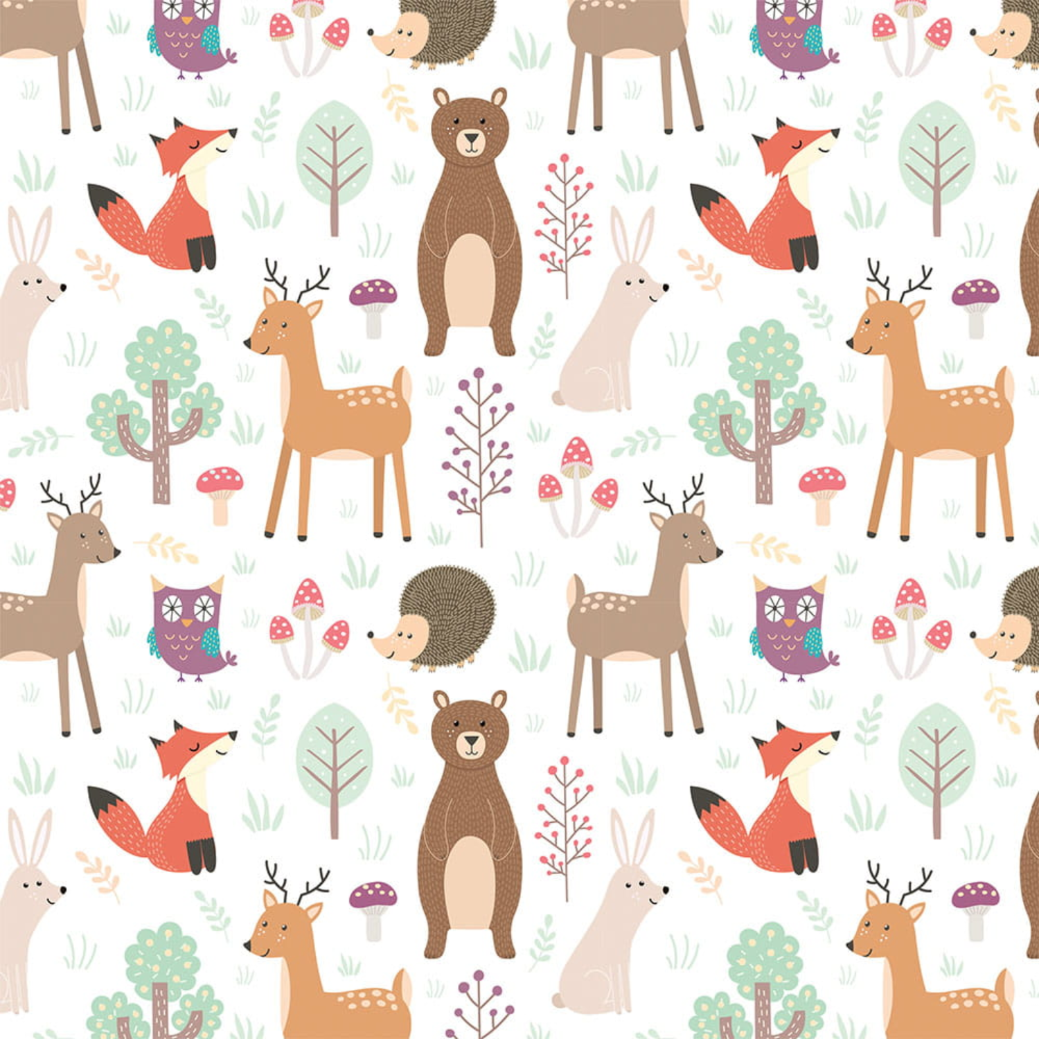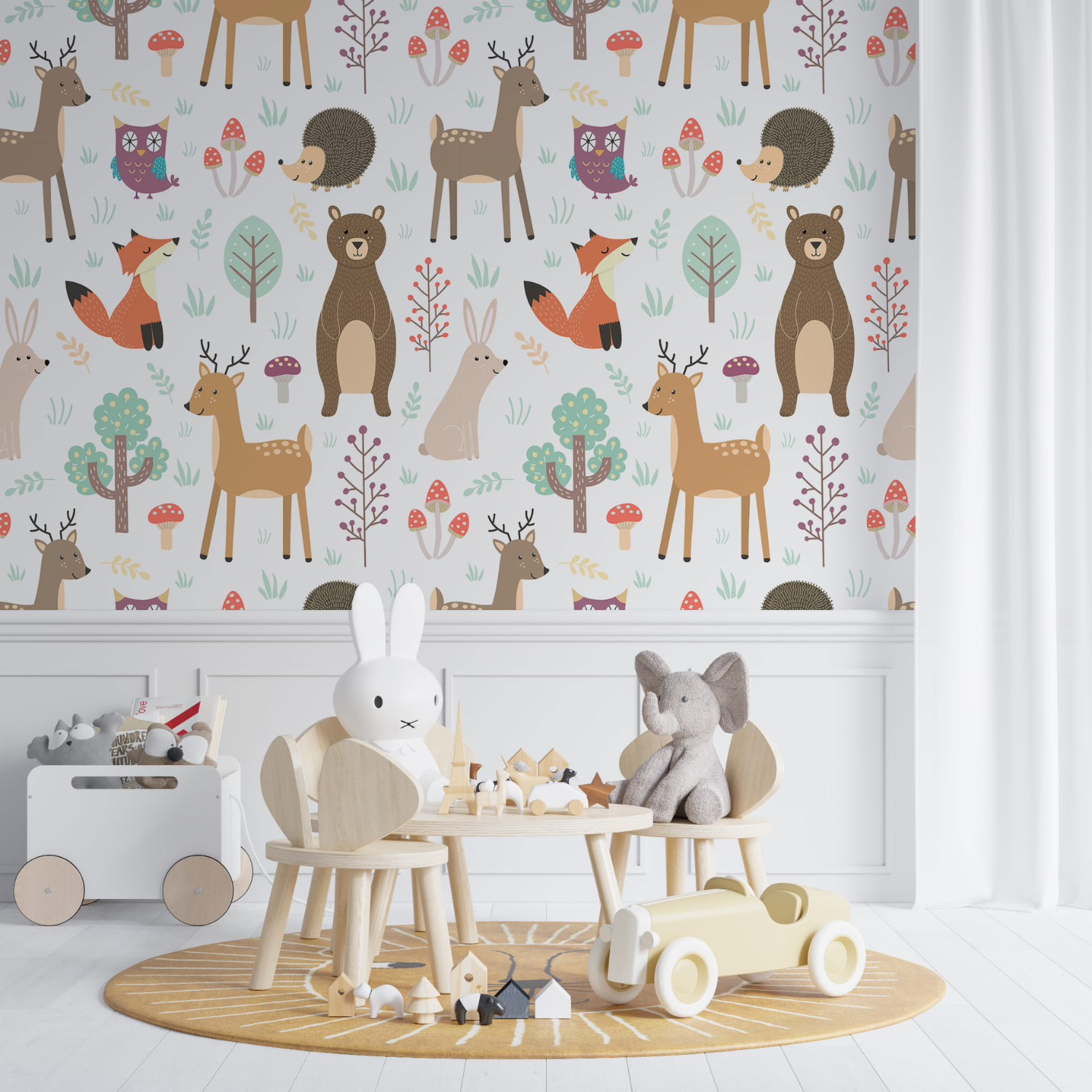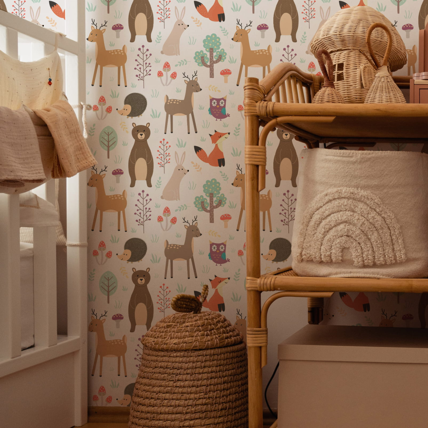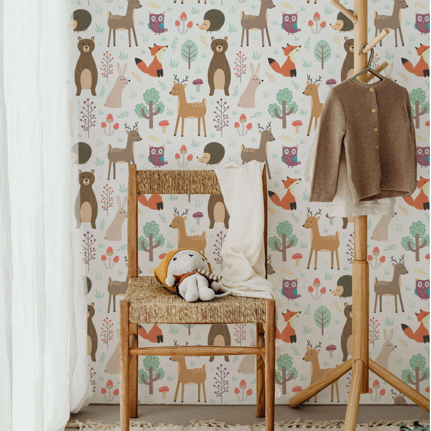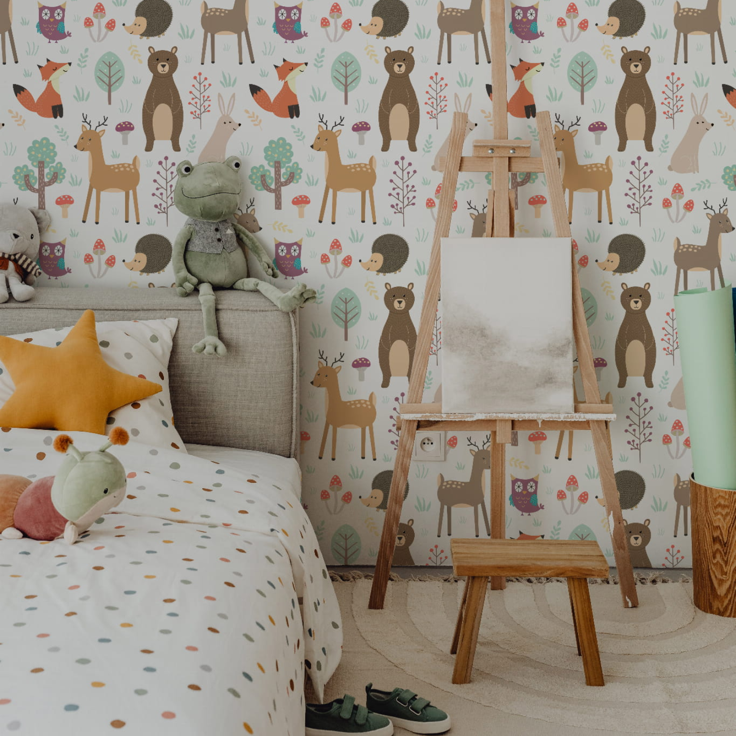 Tapeta Kolorowe zwierzaki to radosna, pełna ciepła kompozycja stworzona z myślą o dziecięcych wnętrzach. Na jasnym tle pojawiają się sympatyczne leśne zwierzątka: misie, liski, sarenki, jeżyki, króliczki oraz sowy, otoczone drzewkami, grzybkami i delikatnymi roślinami. Ilustracje mają miękką, bajkową formę i przyjazne wyrazy pyszczków, które budzą uśmiech i poczucie bezpieczeństwa. Pastelowa paleta barw – beże, zielenie, brązy i subtelne akcenty różu – sprawia, że tapeta jest spokojna i harmonijna, a jednocześnie bardzo dekoracyjna. Wzór doskonale sprawdzi się w pokoju niemowlęcym, dziecięcym lub kąciku zabaw, wspierając rozwój wyobraźni i miłość do natury. Tapeta Kolorowe zwierzaki łatwo łączy się z drewnianymi meblami i naturalnymi dodatkami, tworząc przytulną, leśną atmosferę. To idealny wybór dla rodziców, którzy chcą stworzyć wnętrze pełne radości, koloru i dziecięcej magii.