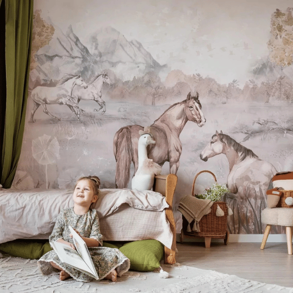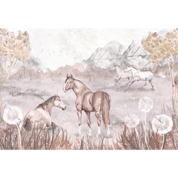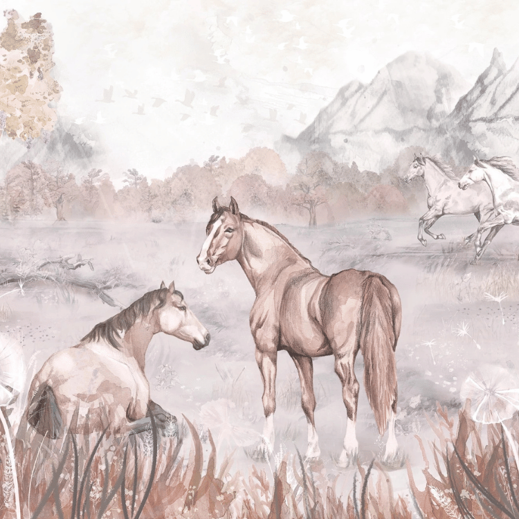 Wprowadź do dziecięcego pokoju spokój, wolność i magię natury dzięki tapecie HORSE VALLEY. Ta wyjątkowa ilustracja przedstawia stado koni galopujących po malowniczej dolinie otoczonej górami, łąkami i dzikimi roślinami. Delikatna akwarelowa kreska i stonowane kolory w odcieniach beżu, brązu i pastelowego różu tworzą kojący, przyjazny klimat idealny do pokoju dziewczynki lub miłośnika przyrody.
