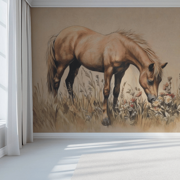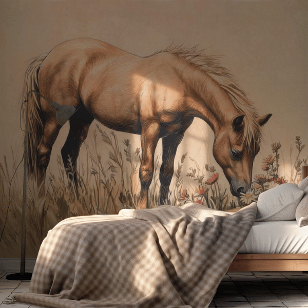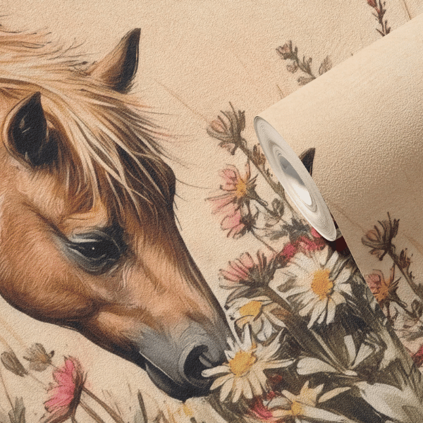 Tapeta została zaprojektowana z myślą o pokojach dziewczynek, szczególnie tych, które kochają konie i świat natury. Ciepłe beże, jasne brązy oraz stonowane odcienie zieleni i kremu sprawiają, że wnętrze staje się przytulne, harmonijne i sprzyjające wyciszeniu. Delikatna kolorystyka nie przytłacza przestrzeni, dzięki czemu tapeta doskonale sprawdzi się zarówno w mniejszych, jak i większych pokojach dziecięcych.