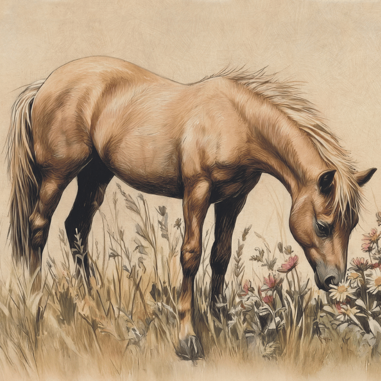 o wyjątkowa dekoracja ścienna, która wprowadza do wnętrza atmosferę spokoju, czułości i bliskości z naturą. Subtelna, akwarelowa ilustracja przedstawiająca konia pochylonego nad łąką pełną delikatnych polnych kwiatów tworzy poetycką scenę, która koi zmysły i pobudza wyobraźnię. To obraz opowiadający o wolności, łagodności oraz niezwykłej relacji człowieka z przyrodą – idealny dla dzieci o wrażliwej duszy.
