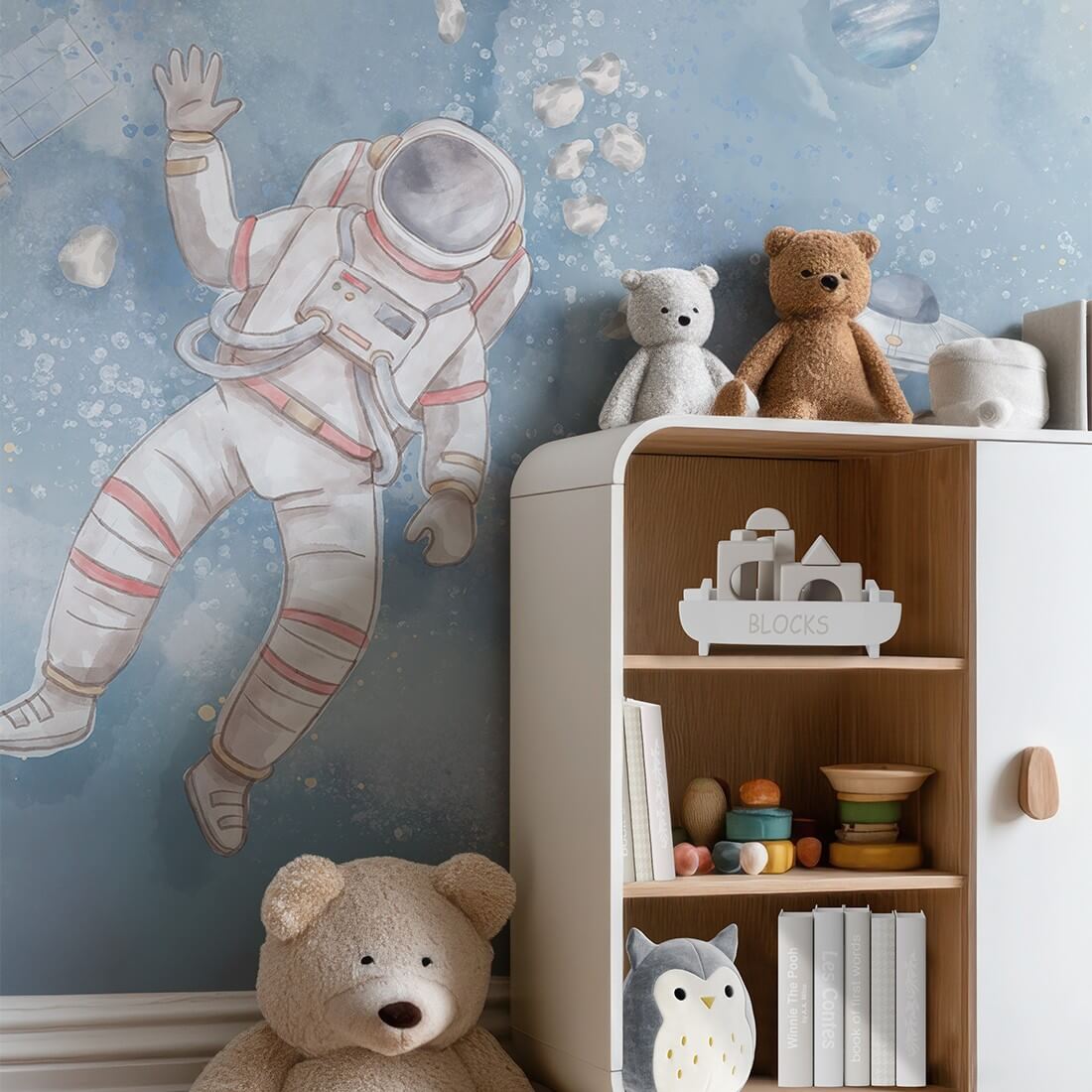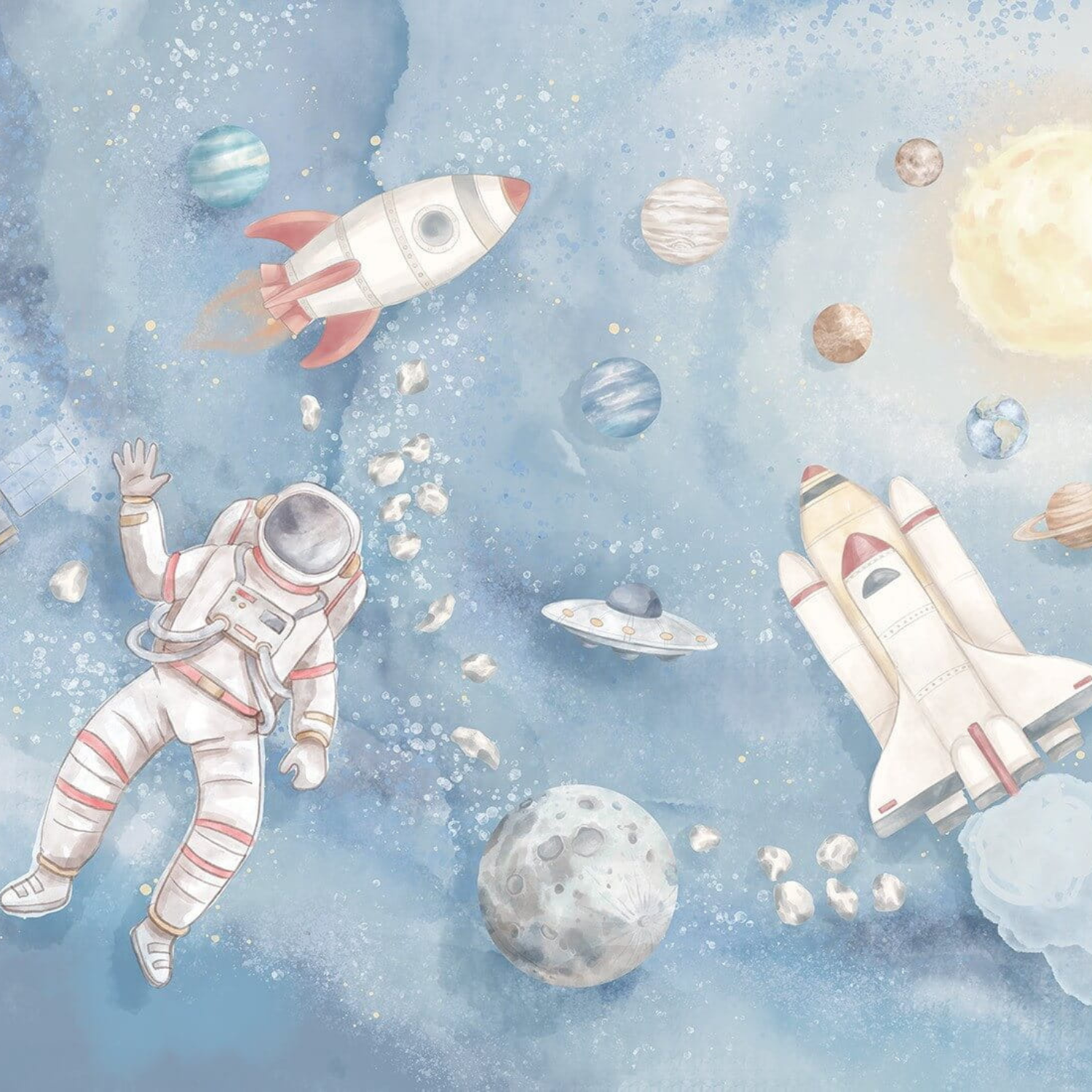 to niezwykle inspirująca dekoracja do pokoju dziecka, która przenosi najmłodszych w fascynujący świat galaktyk i międzyplanetarnych podróży. Na ilustracji przedstawiono astronautę unoszącego się w przestrzeni kosmicznej, rakiety, prom kosmiczny, planety oraz gwiazdy rozświetlające niebieskie, akwarelowe tło.