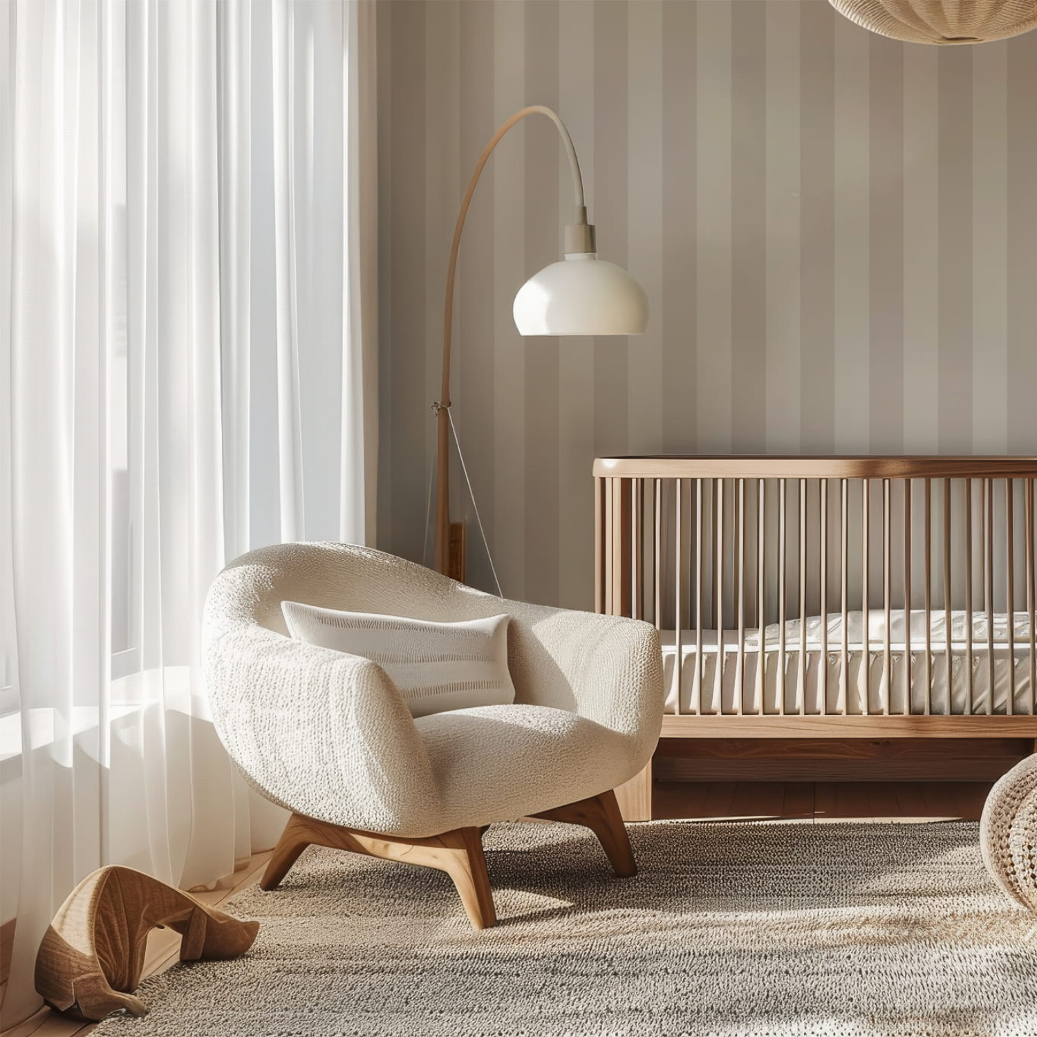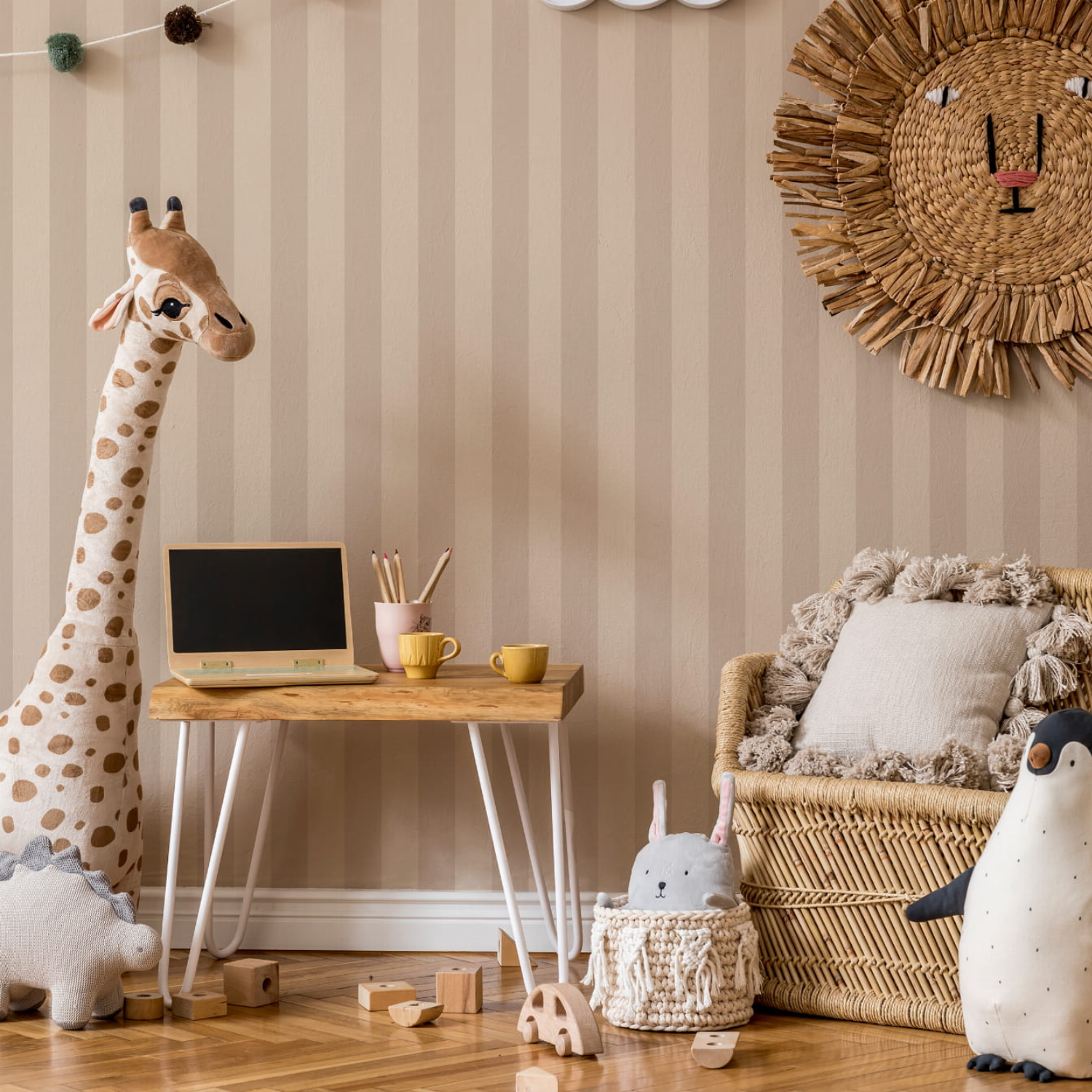 Tapeta może być wykorzystana na wszystkich ścianach lub jako delikatna ściana akcentowa. To bezpieczny i stylowy wybór, który wprowadza do pokoju ciepło, równowagę i estetyczną spójność, tworząc przyjazną przestrzeń do codziennego funkcjonowania. Kremowe pasy wprowadzają do wnętrza poczucie spokoju i naturalnej elegancji. Tapeta stanowi doskonałą bazę do tworzenia zarówno subtelnych, jak i bardziej wyrazistych aranżacji. Jej uniwersalny charakter sprawia, że będzie pięknie wyglądać przez wiele lat, niezależnie od wieku dziecka.