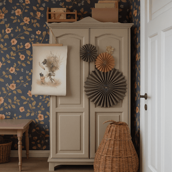 Tapeta pięknie komponuje się z jasnymi panelami – szczególnie białymi, łososiowymi, jasnozielonymi lub w tonacji jasnej szarości. Dzięki temu z łatwością dopasujesz ją do różnych aranżacji, zarówno klasycznych, jak i bardziej nowoczesnych.