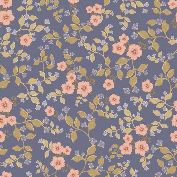 Na głębokim, chabrowym tle rozkwitają drobne kwiatki w odcieniu łososia, mierzące zaledwie 3–4 cm. Ich delikatność sprawia, że wzór nie przytłacza wnętrza, a jednocześnie dodaje mu charakteru i przytulności.