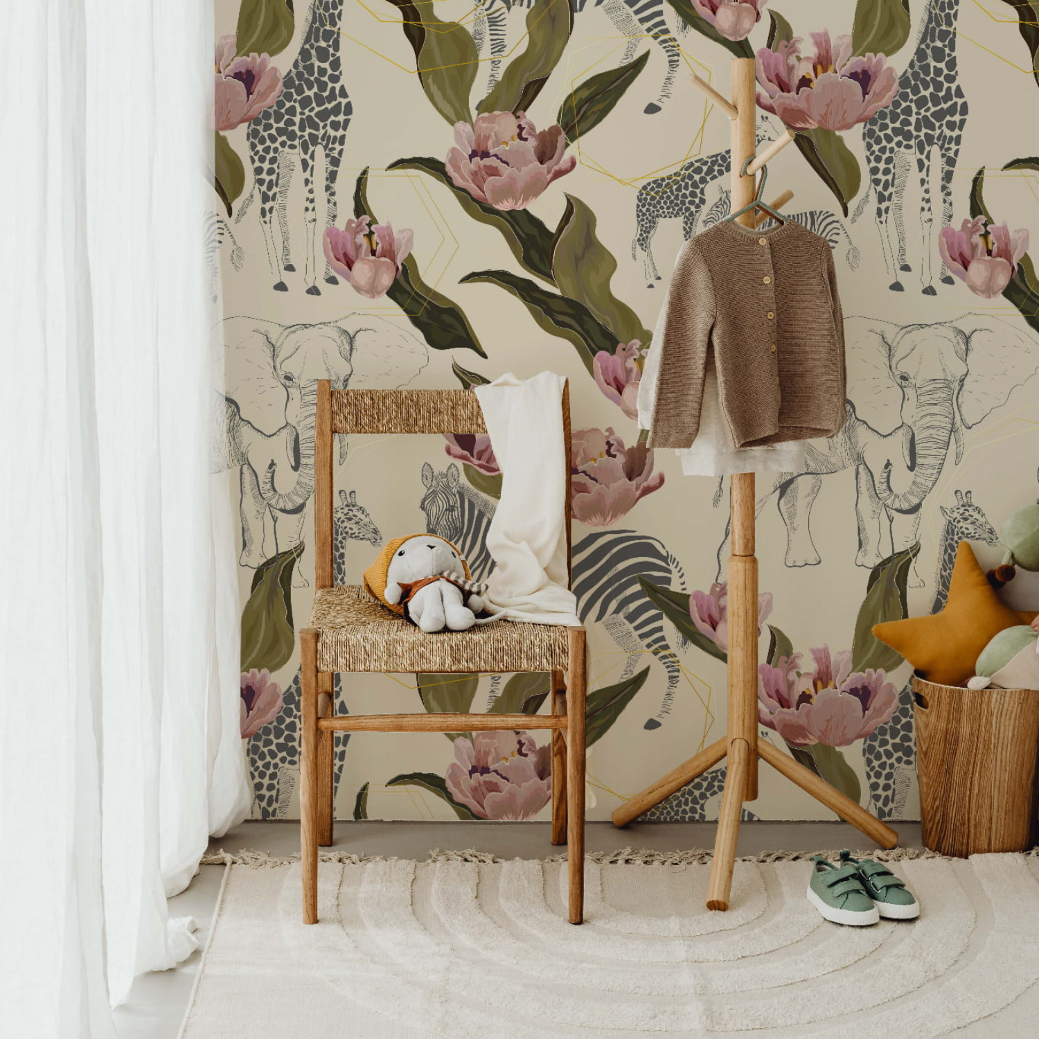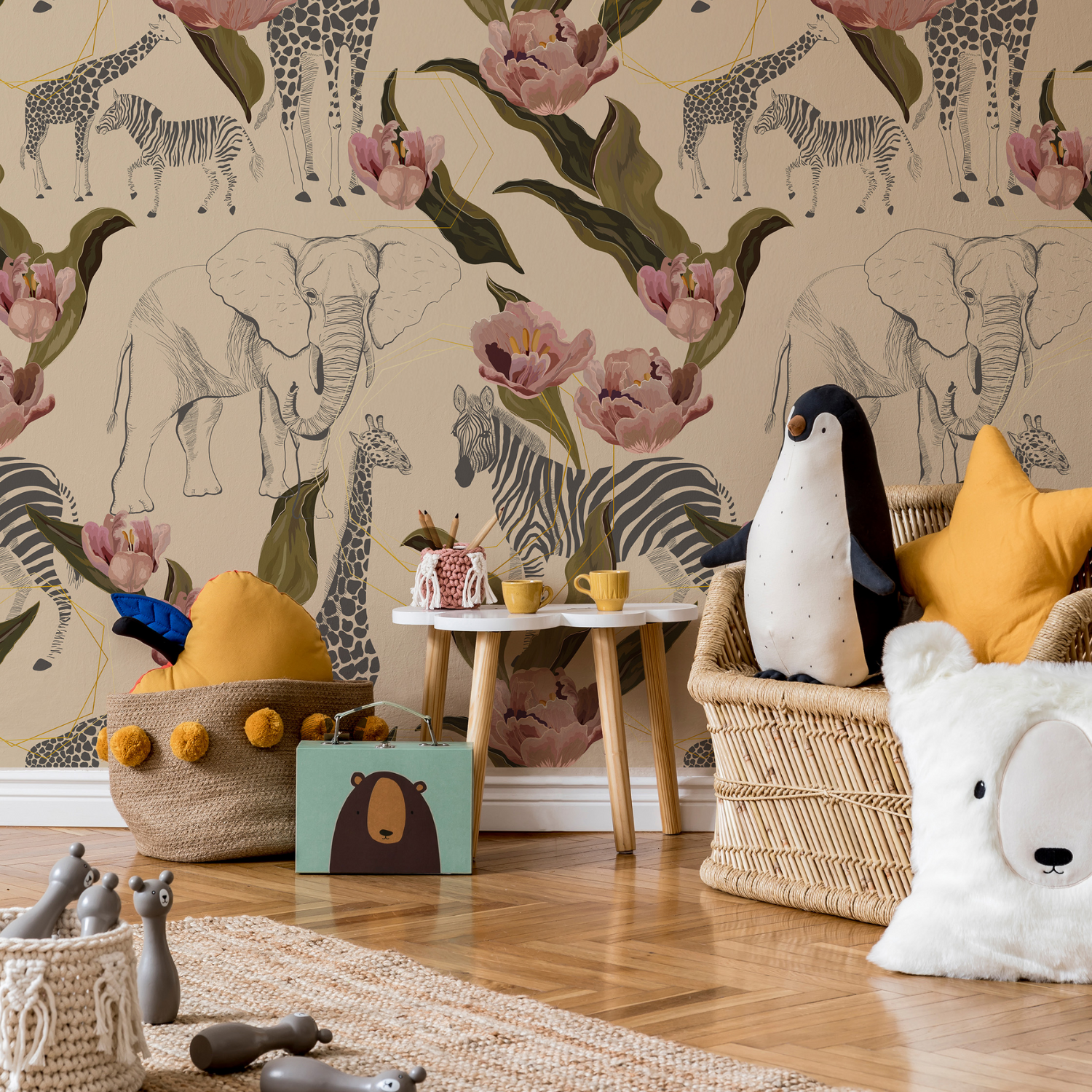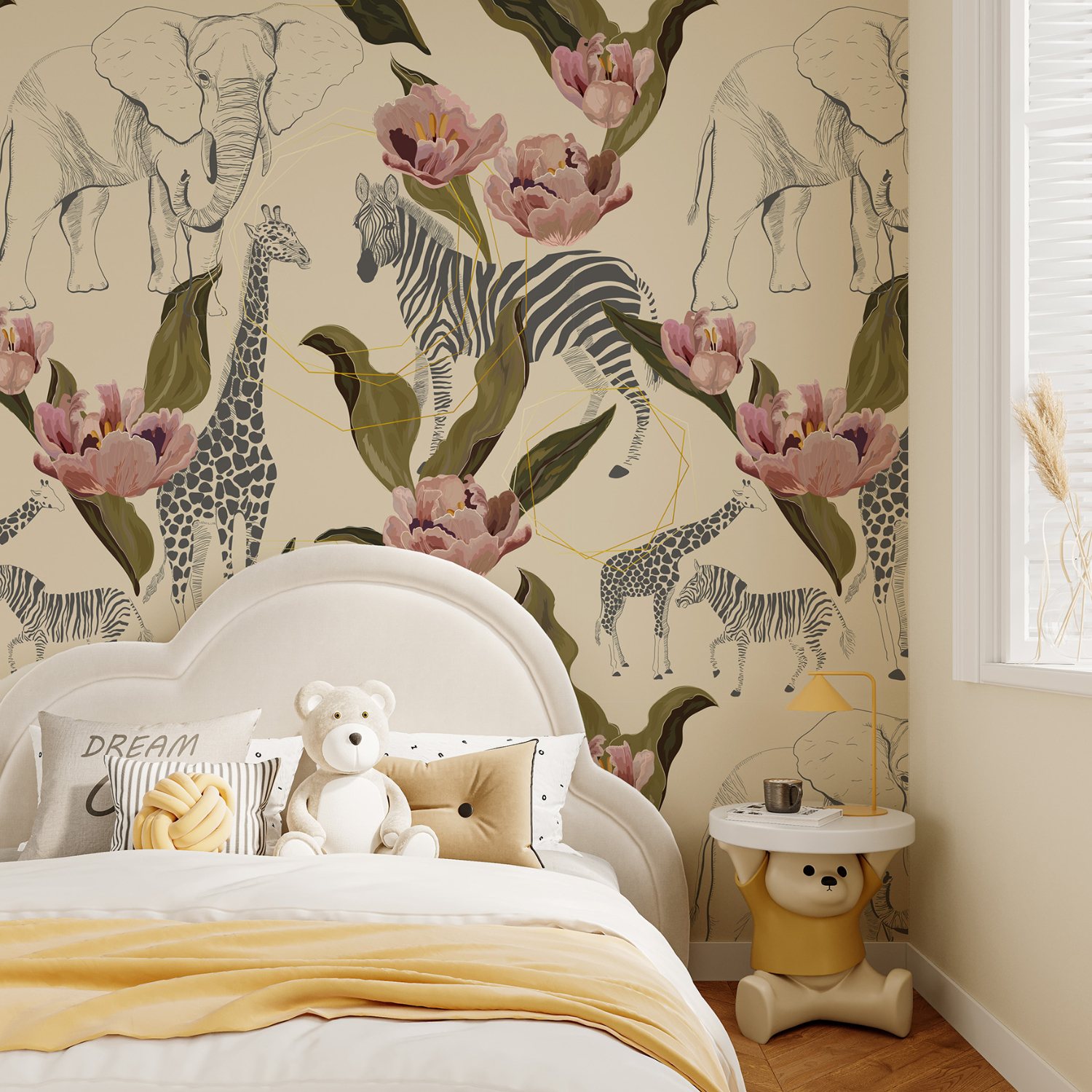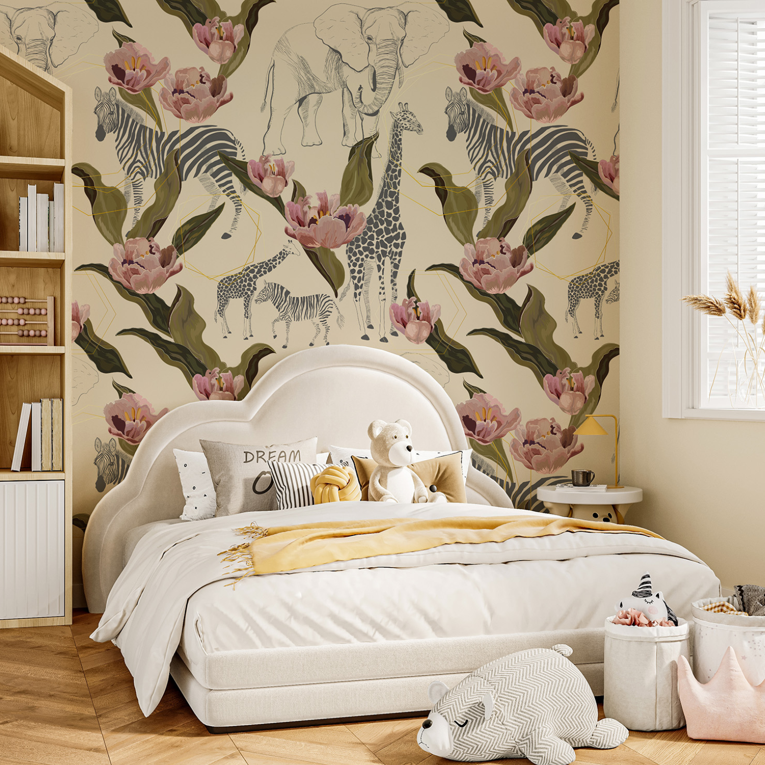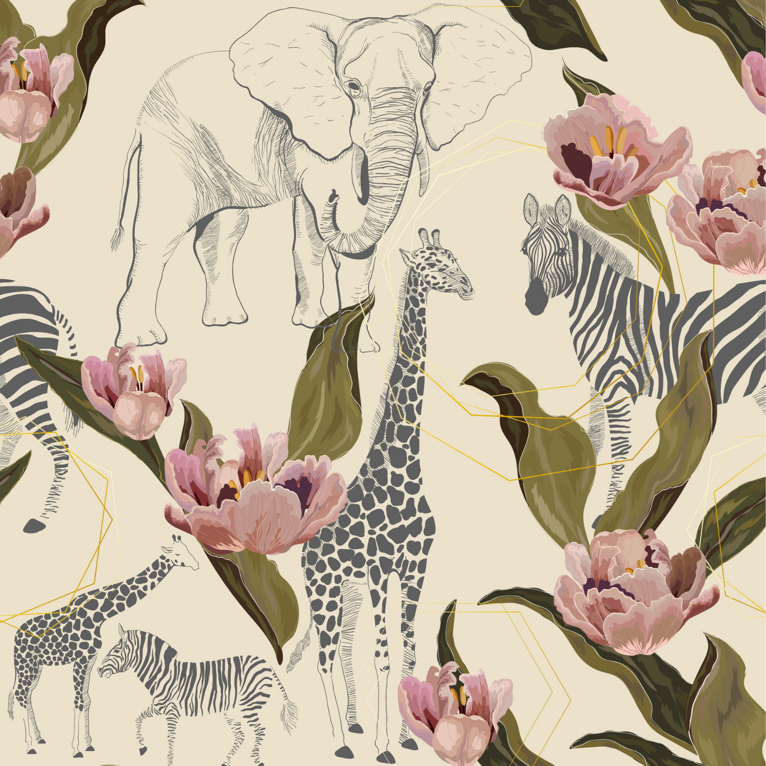 Tapeta Kwieciste safari to wyjątkowe połączenie egzotyki dzikiej przyrody z delikatnością botanicznych ilustracji. Na jasnym, ciepłym tle pojawiają się ręcznie rysowane sylwetki safari: majestatyczny słoń, smukła żyrafa oraz elegancka zebra, przedstawione w subtelnej, szkicowej formie. Zwierzęta przeplatają się z dużymi, dekoracyjnymi kwiatami w odcieniach pudrowego różu i zieleni, które nadają całości miękkości i artystycznego charakteru. Kompozycja balansuje między naturą a elegancją, dzięki czemu tapeta jest wyrazista, ale nie przytłaczająca. Motyw safari został tu ukazany w spokojnej, niemal ilustracyjnej odsłonie, idealnej do wnętrz dziecięcych, ale także stylowych przestrzeni rodzinnych. Tapeta wprowadza do pomieszczenia atmosferę przygody, harmonii i bliskości natury. Doskonale sprawdzi się jako dekoracja ściany w pokoju dziecka, kąciku zabaw lub nowoczesnej sypialni, tworząc ciepłe i inspirujące tło dla codziennych chwil.