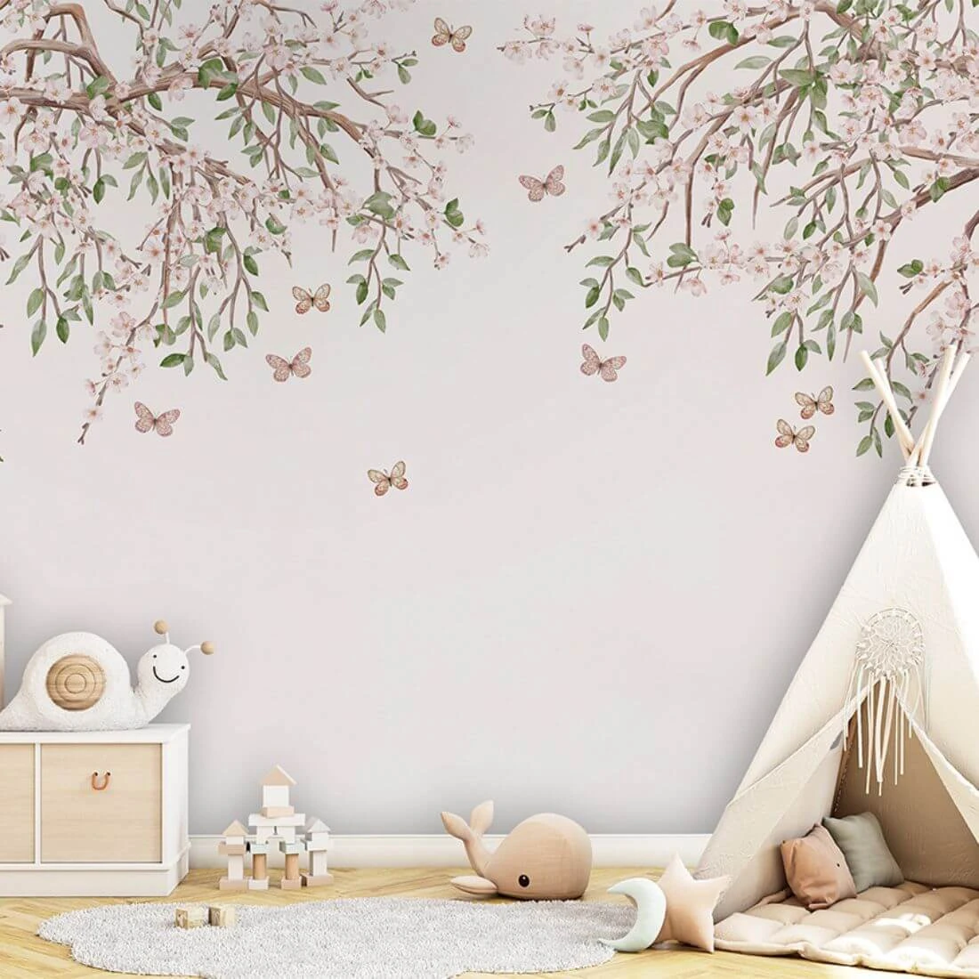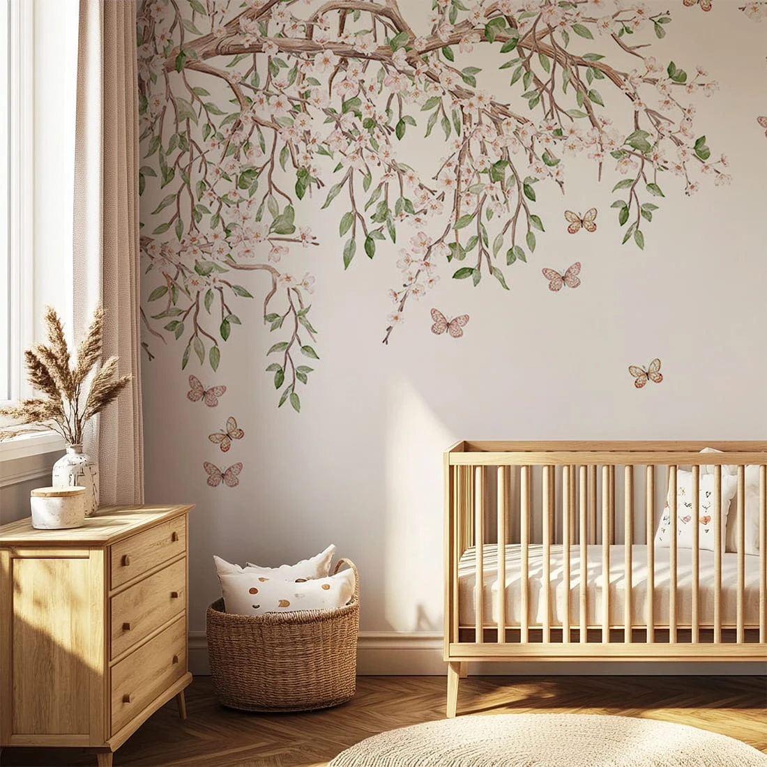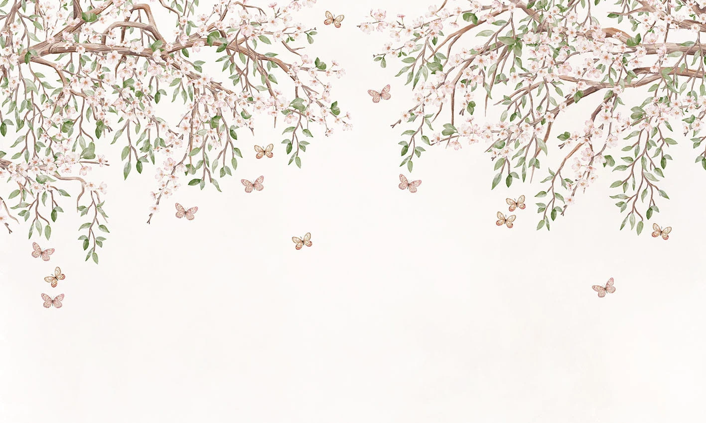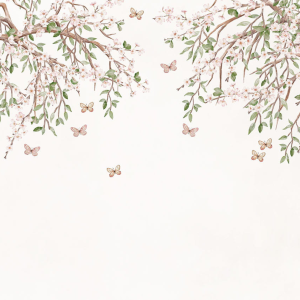 to subtelna i elegancka dekoracja ścienna inspirowana naturą. Delikatne gałęzie obsypane drobnymi, jasnoróżowymi kwiatami tworzą lekką kompozycję, która rozpościera się od góry, pozostawiając przestrzeń i wrażenie lekkości na ścianie. Pomiędzy gałązkami unoszą się drobne motyle, dodając całości romantycznego i bajkowego charakteru.