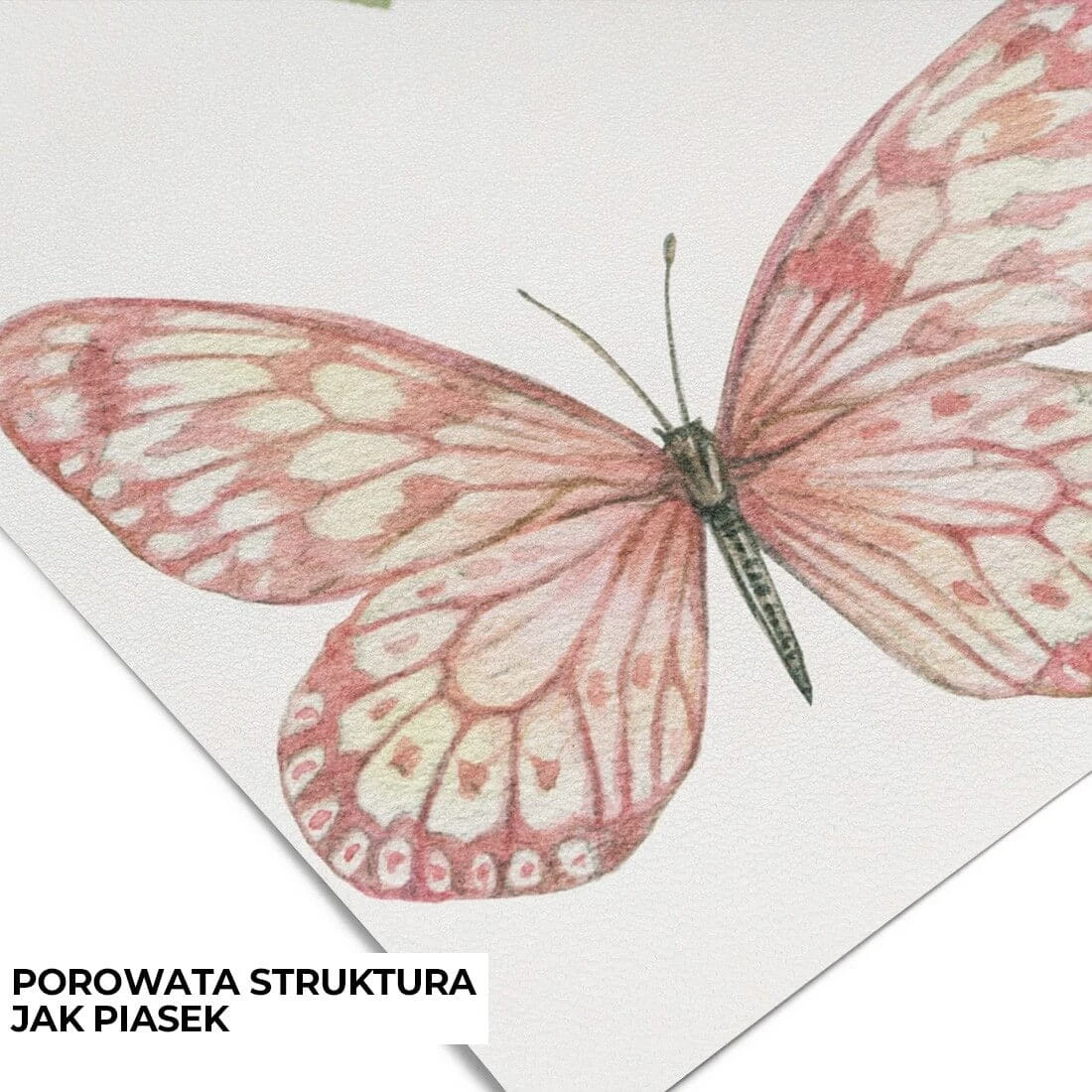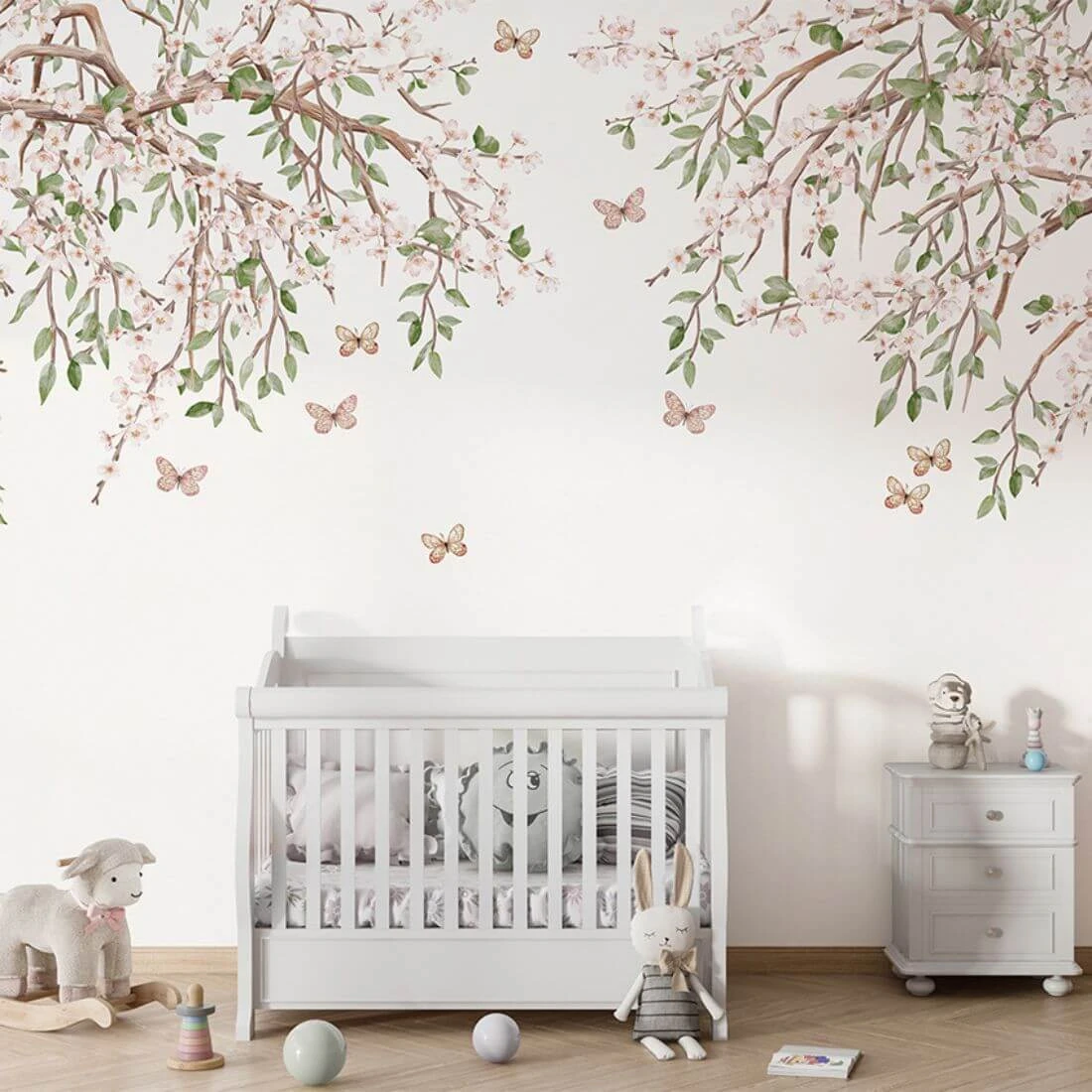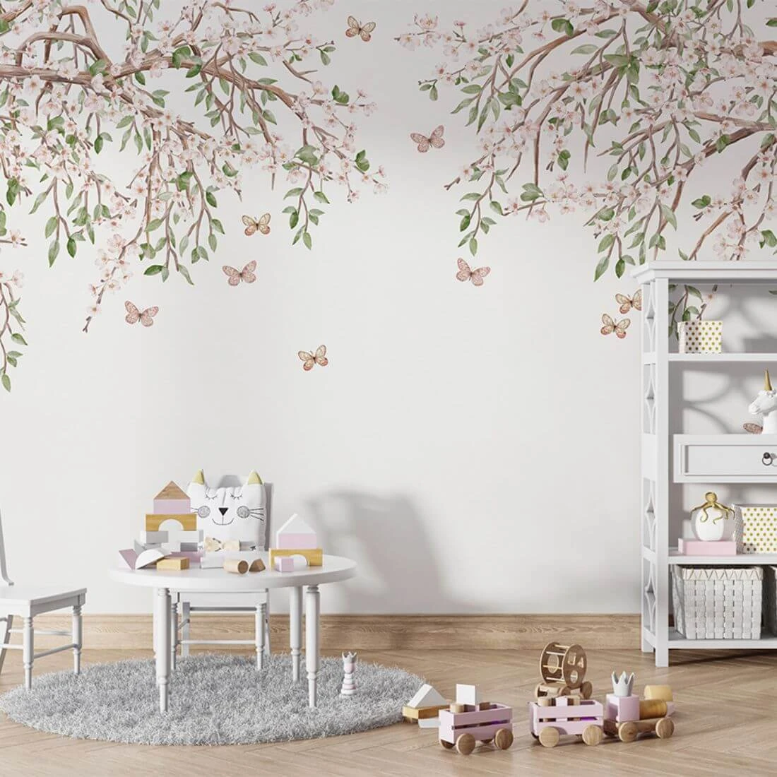 to subtelna i elegancka dekoracja ścienna inspirowana naturą. Delikatne gałęzie obsypane drobnymi, jasnoróżowymi kwiatami tworzą lekką kompozycję, która rozpościera się od góry, pozostawiając przestrzeń i wrażenie lekkości na ścianie. Pomiędzy gałązkami unoszą się drobne motyle, dodając całości romantycznego i bajkowego charakteru.