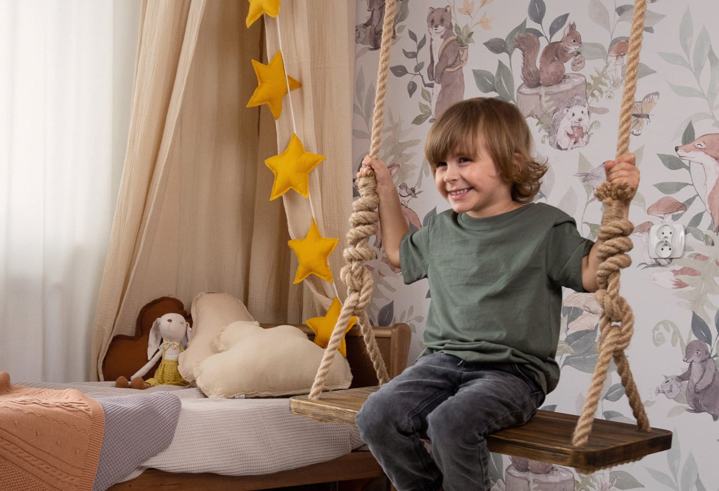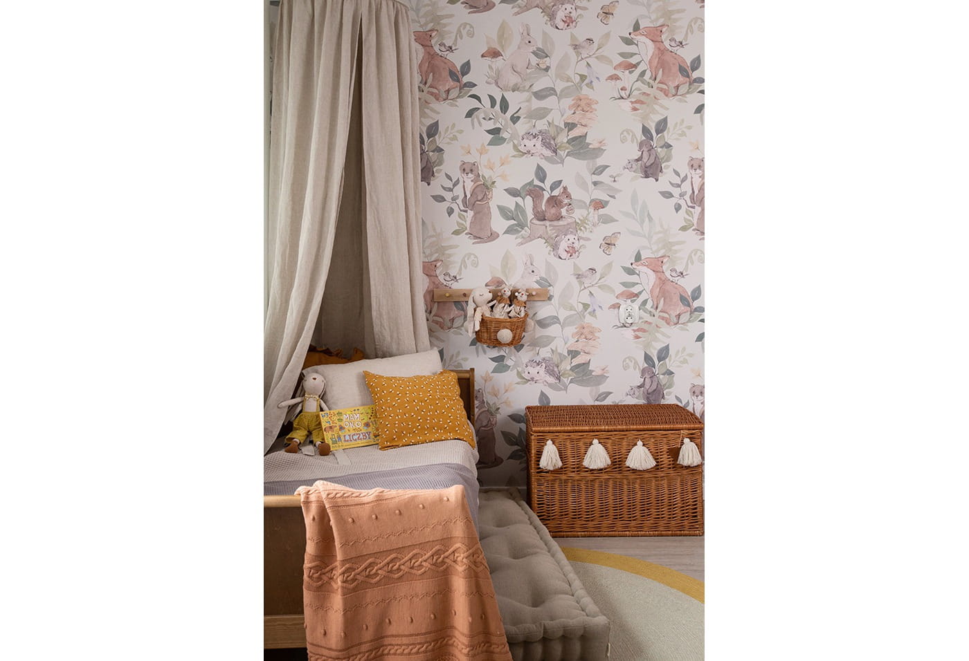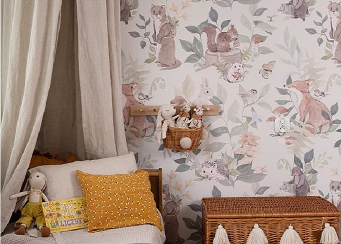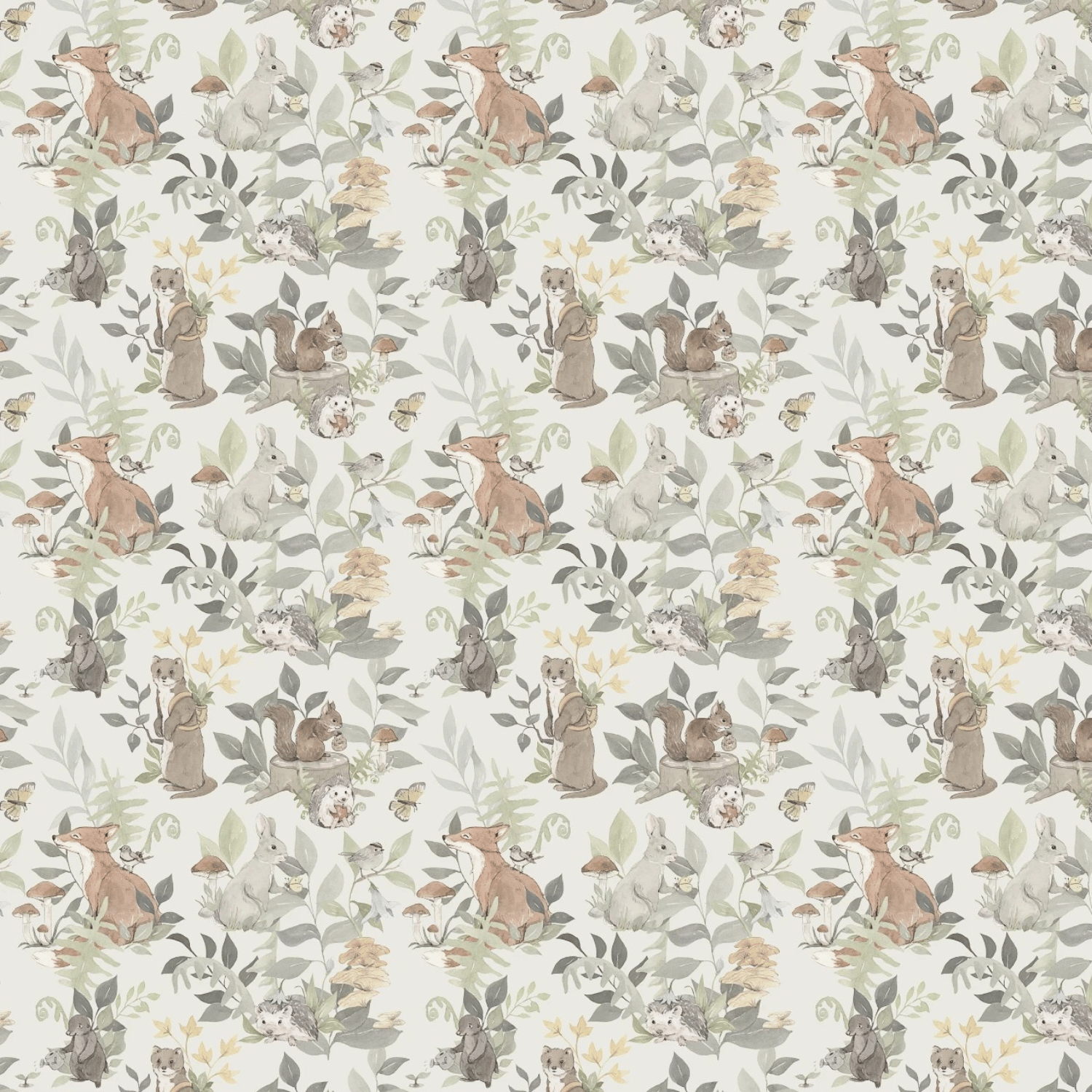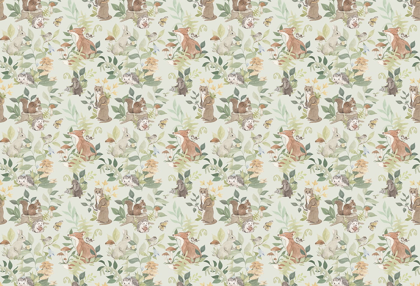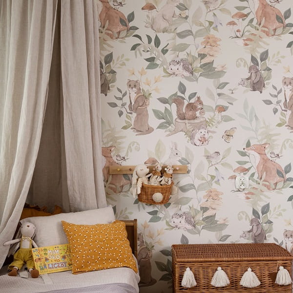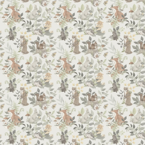 Tapeta idealna do pokoju niemowlaka i starszego dziecka przedstawia leśne zwierzęta, takie jak lisy, króliki, jeże, wiewiórki i ptaki, w otoczeniu bujnej roślinności. Wzory są utrzymane w pastelowych kolorach, co nadaje całości delikatności i subtelności. Tapeta jest wykonana w akwarelowym stylu, a jej stonowane barwy - zielony, brązowy, beżowy i szary - tworzą spokojną i przyjazną atmosferę. Tło tapety utrzymane jest w odcieniu delikatnej zieleni, co dodatkowo wprowadza do wnętrza element natury i harmonii.