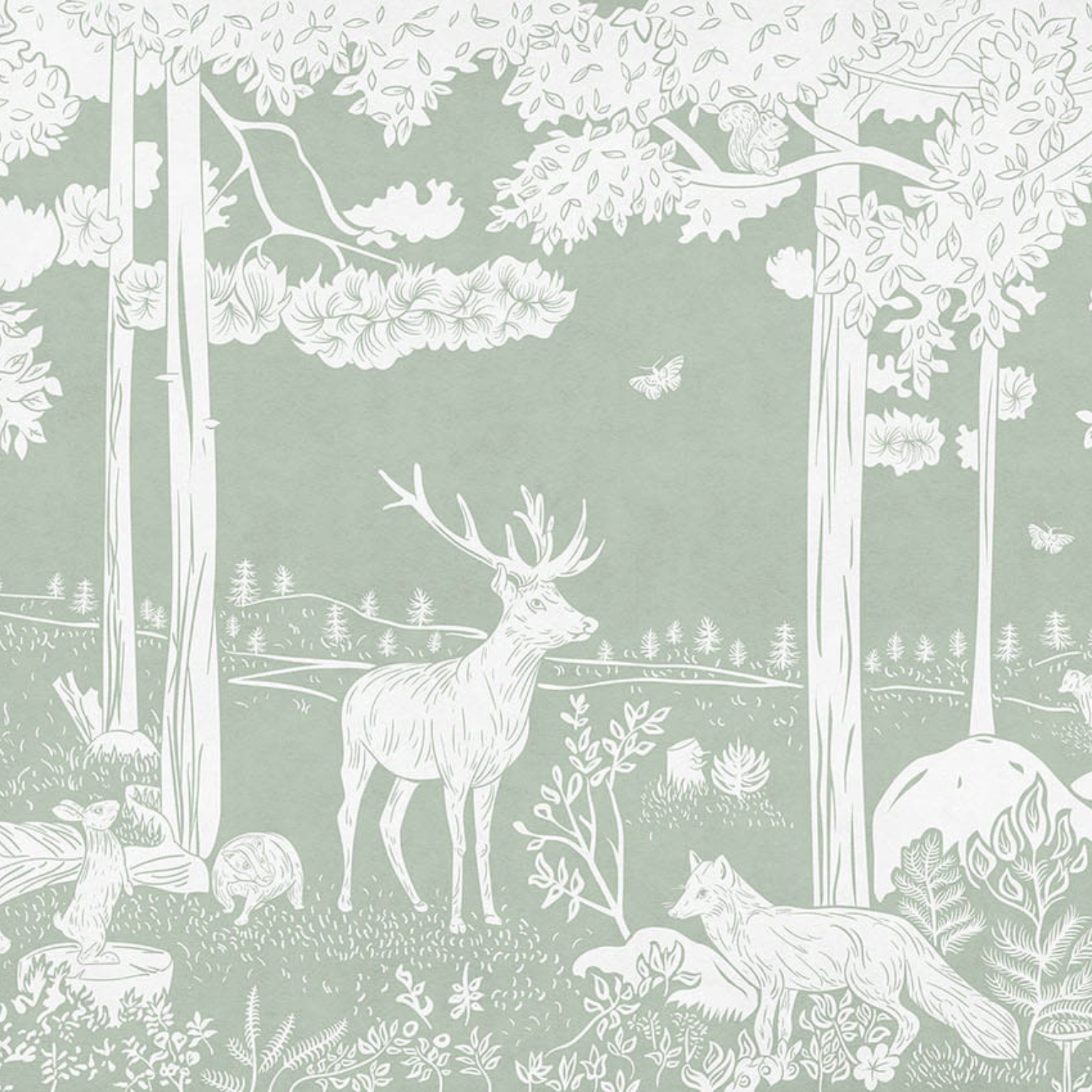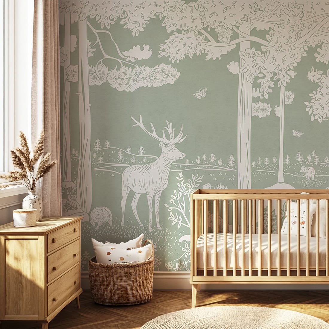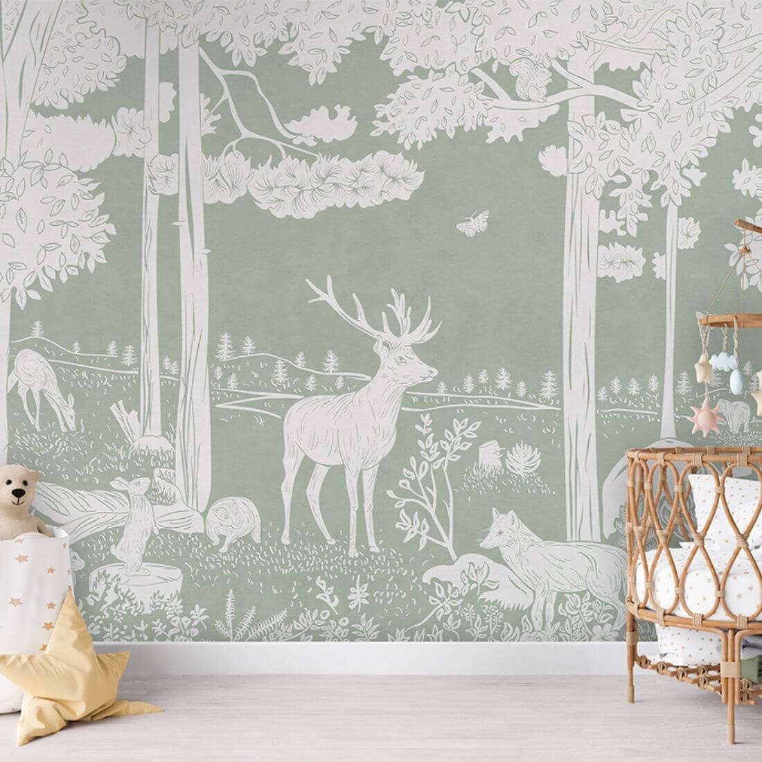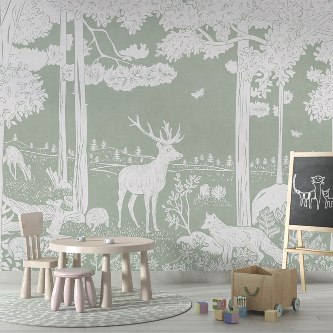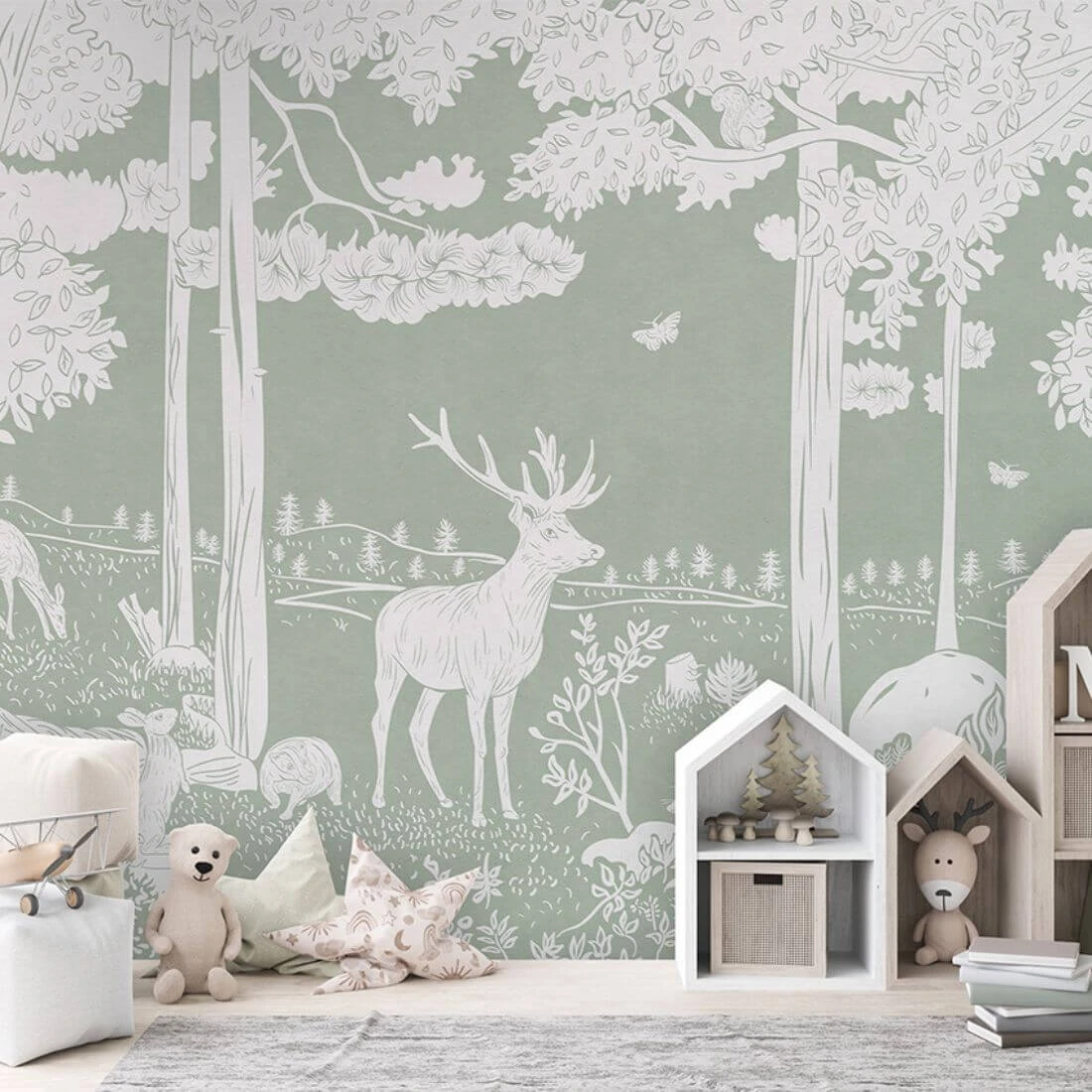 to elegancka i spokojna dekoracja do pokoju dziecka, inspirowana naturą i dziką przyrodą. Subtelne, monochromatyczne ilustracje przedstawiają jelenie, lisy oraz inne leśne zwierzęta w otoczeniu drzew i roślinności, tworząc harmonijną, wyciszającą przestrzeń sprzyjającą odpoczynkowi.