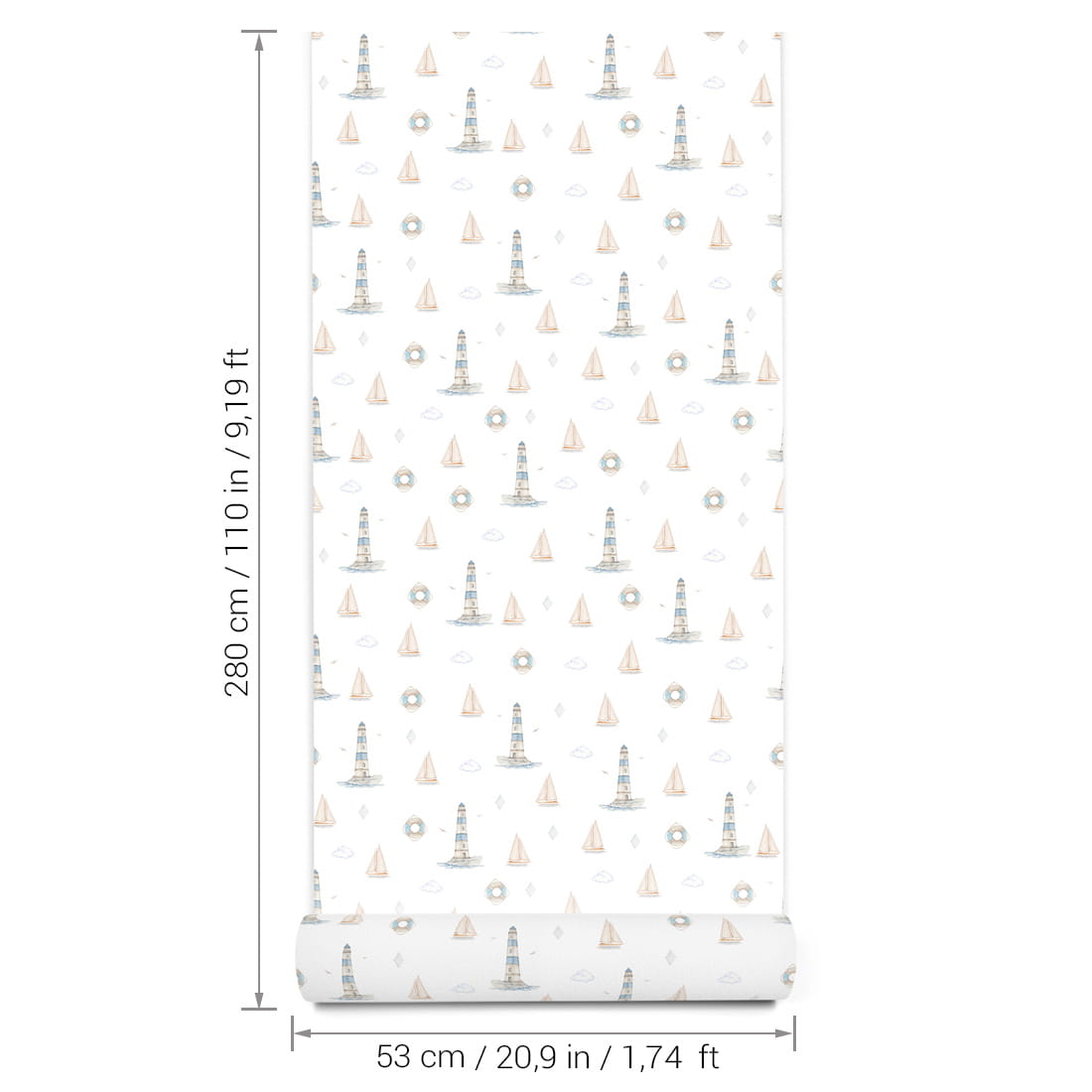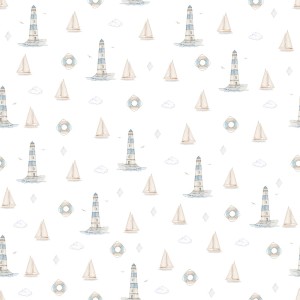 to delikatna i stylowa dekoracja do pokoju dziecka. Wzór przedstawia akwarelowe ilustracje latarni morskich, żaglówek, kół ratunkowych oraz chmur i mew, które tworzą lekki, nadmorski klimat. Całość utrzymana jest w spokojnych odcieniach błękitu, beżu i jasnej szarości na jasnym tle.