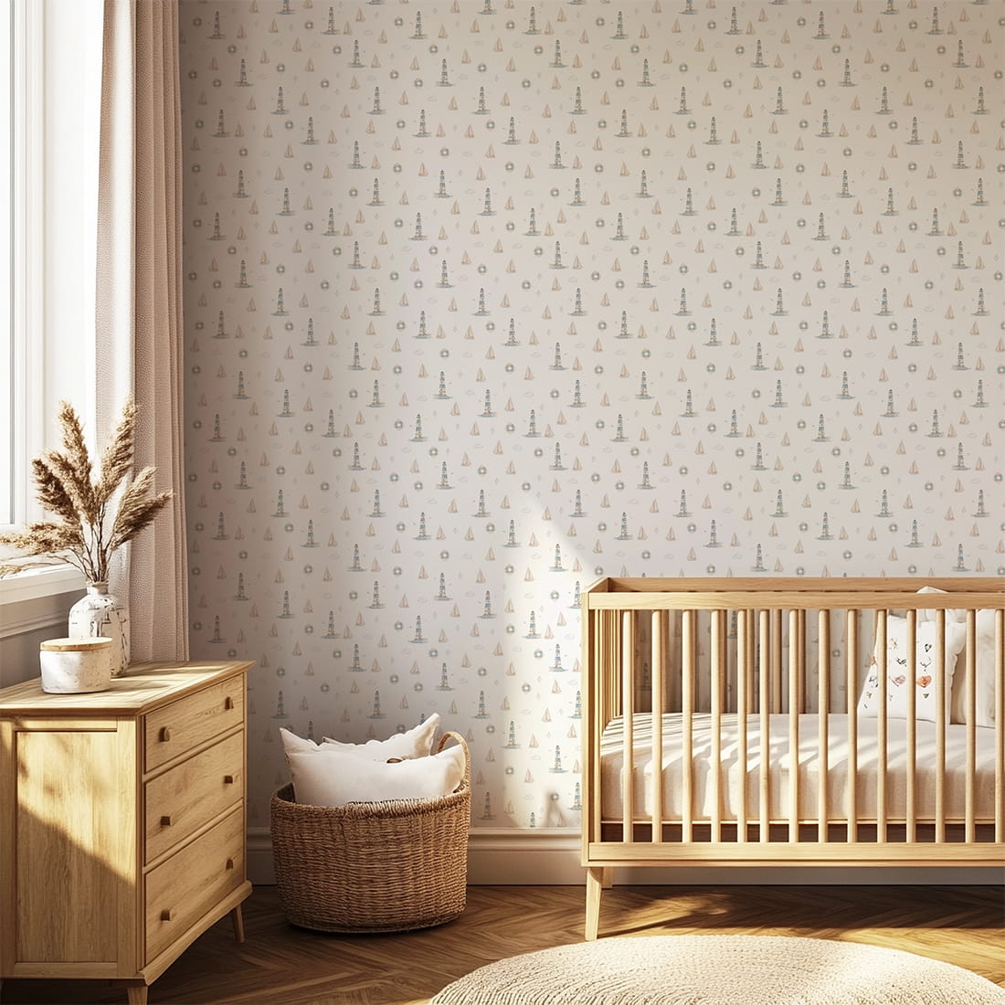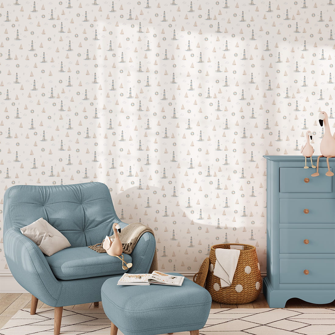 Subtelny, powtarzalny wzór wprowadza do wnętrza harmonię i świeżość, jednocześnie nie przytłaczając przestrzeni. Tapeta doskonale sprawdzi się w pokoju chłopca, pokoju dziewczynki lub w pokoju niemowlęcia, szczególnie w aranżacjach inspirowanych stylem marynistycznym, skandynawskim lub naturalnym.