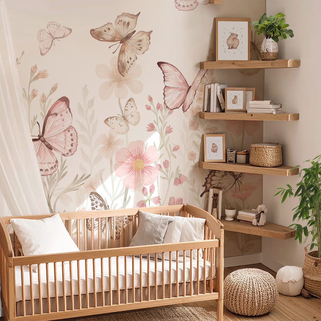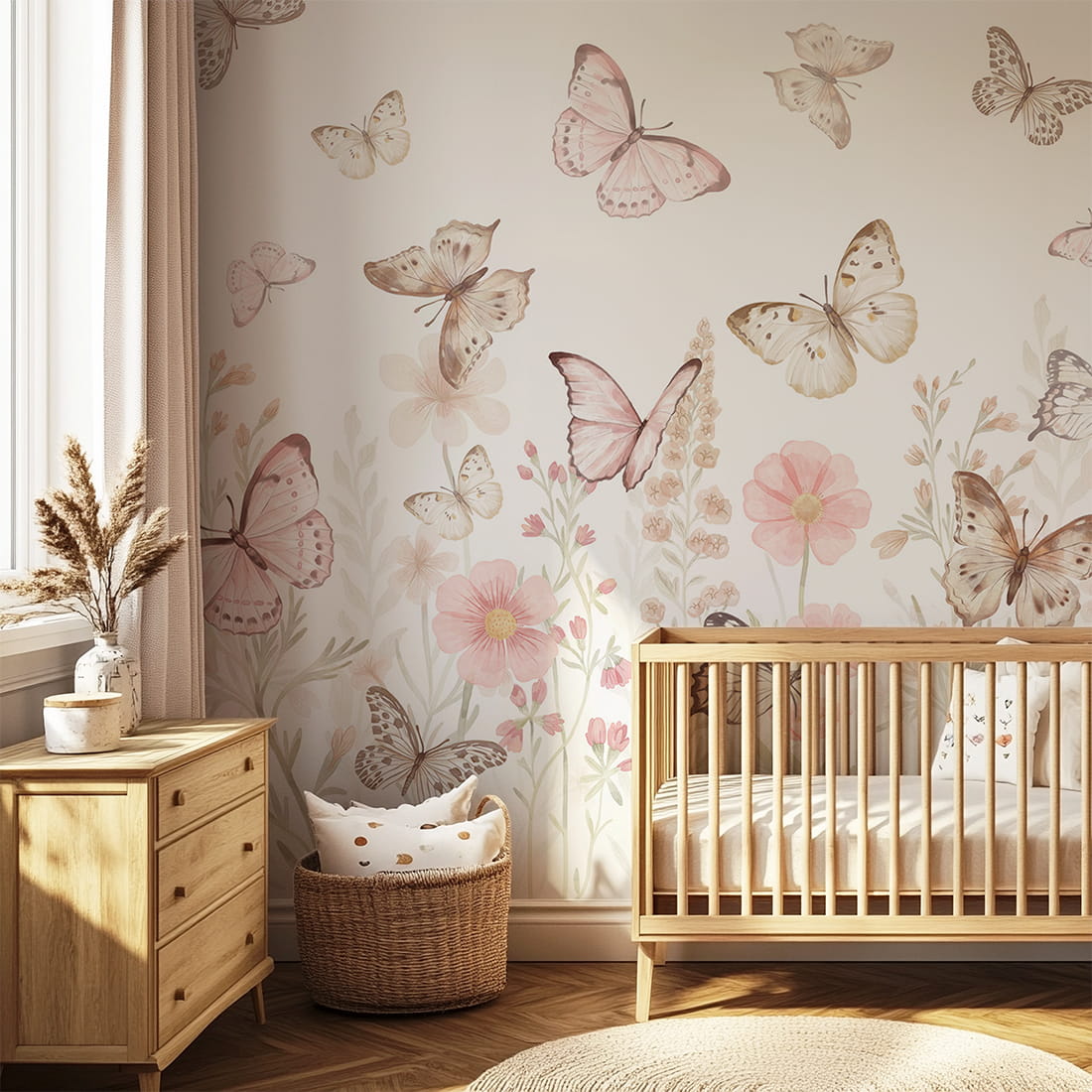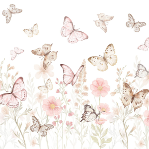 to niezwykle delikatna i romantyczna dekoracja do pokoju dziecka. Wzór przedstawia piękne, akwarelowe motyle unoszące się nad subtelną łąką pełną pastelowych kwiatów i roślin. Całość utrzymana jest w łagodnych odcieniach pudrowego różu, beżu i kremowej bieli, co nadaje wnętrzu lekkości oraz bajkowego charakteru.