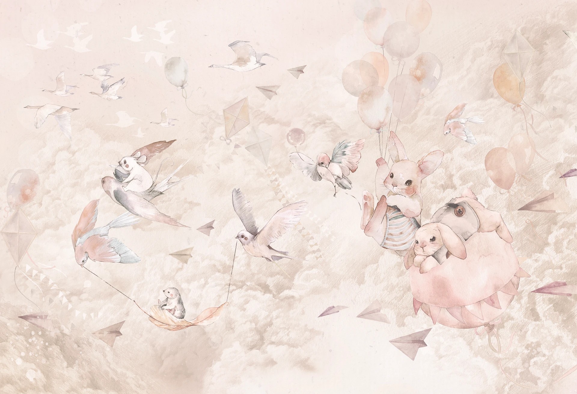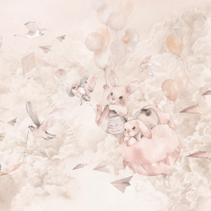 Tapeta do pokoju dziecka przedstawia uroczy, pastelowy krajobraz pełen zwierzątek i bajkowych elementów, utrzymany w różowej kolorystyce. Widzimy tu małe zwierzątka, takie jak króliki i myszy, które unoszą się w powietrzu przy pomocy balonów i latawców. Ptaki niosą te zwierzątka na swoich grzbietach, a w tle widoczne są chmury oraz samolot. Cała scena utrzymana jest w delikatnych, pastelowych barwach, co nadaje jej spokojny i przytulny charakter.