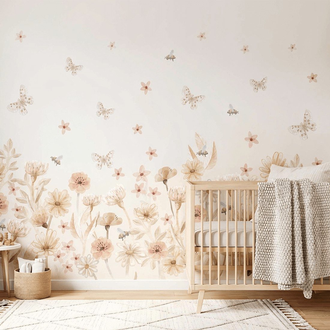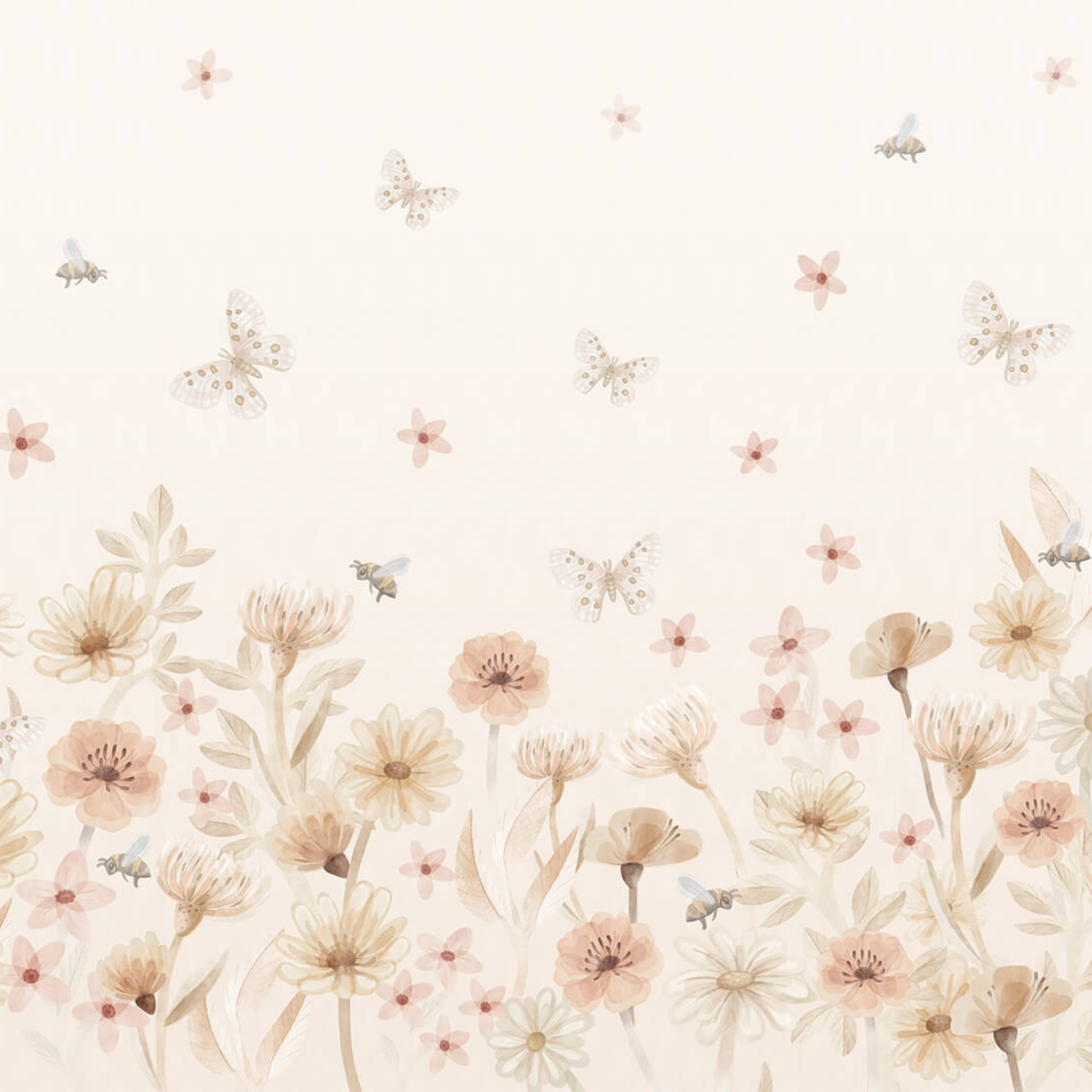 to subtelna i romantyczna dekoracja do pokoju dziecka. Wzór przedstawia akwarelowe kwiaty w odcieniach beżu, kremu i pudrowego różu, nad którymi unoszą się lekkie motyle oraz małe pszczółki. Kompozycja przypomina spokojną, letnią łąkę pełną kwiatów i delikatnych roślin.