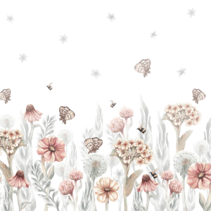 to subtelna i romantyczna dekoracja do pokoju dziecka. Wzór przedstawia akwarelowe kwiaty w odcieniach beżu, kremu i pudrowego różu, nad którymi unoszą się lekkie motyle oraz małe pszczółki. Kompozycja przypomina spokojną, letnią łąkę pełną kwiatów i delikatnych roślin.