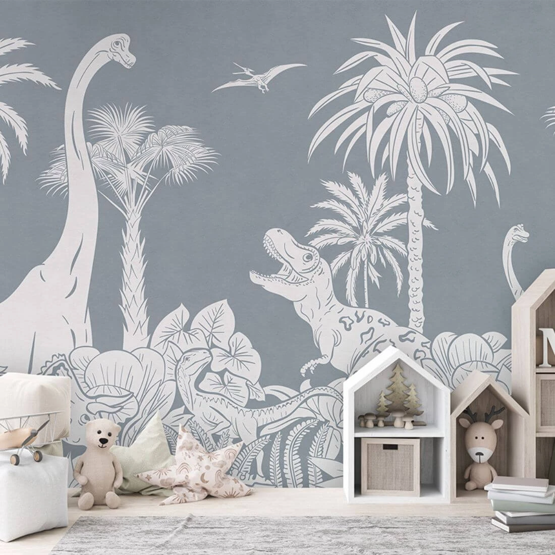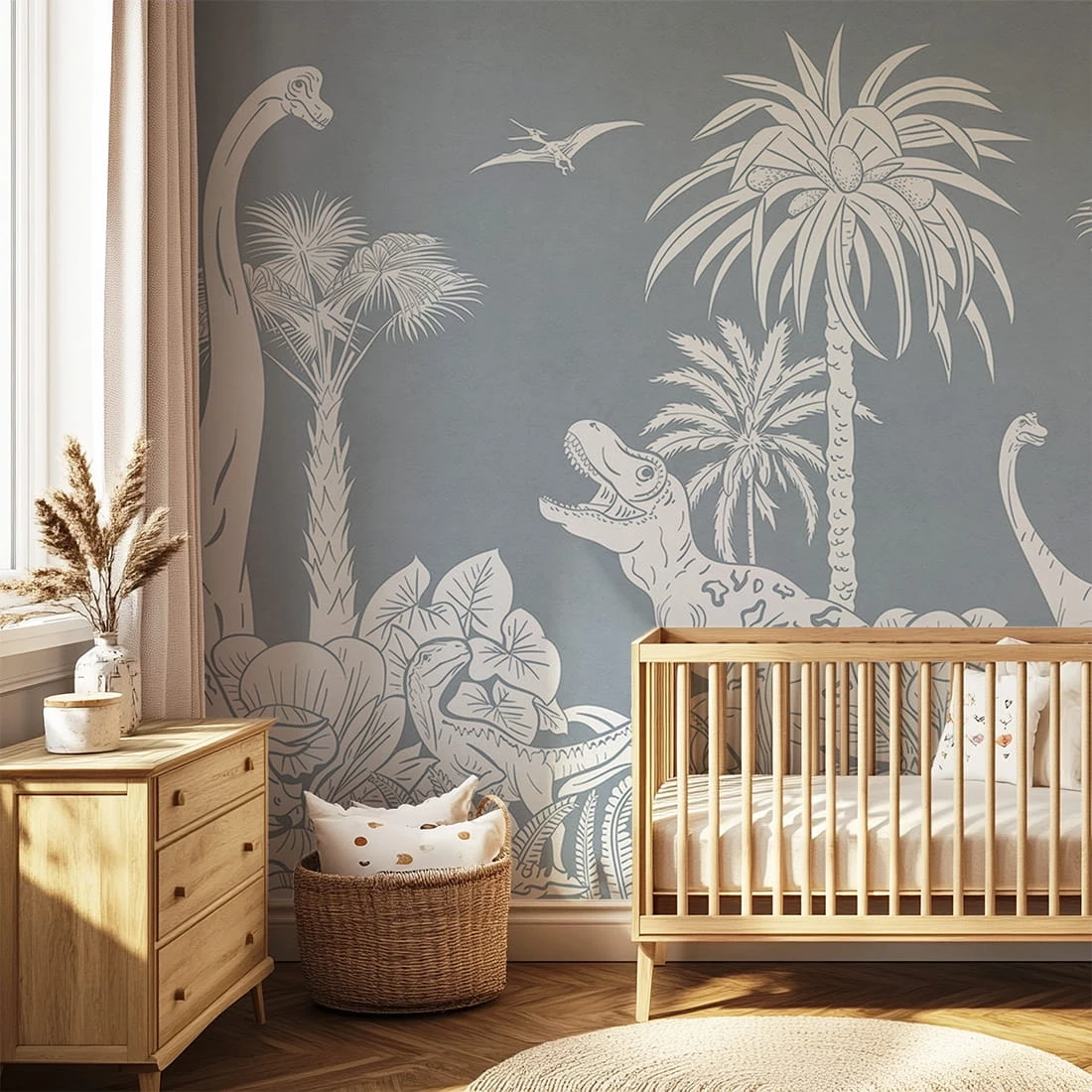 to wyjątkowa propozycja do pokoju dziecka, która przenosi w fascynujący świat prehistorycznej przygody. Subtelne, monochromatyczne ilustracje dinozaurów wśród egzotycznej roślinności tworzą spokojną, a jednocześnie ciekawą aranżację. Delikatna kreska i stonowana stylistyka sprawiają, że tapeta nie przytłacza wnętrza, a jednocześnie rozwija wyobraźnię i zainteresowanie światem natury.