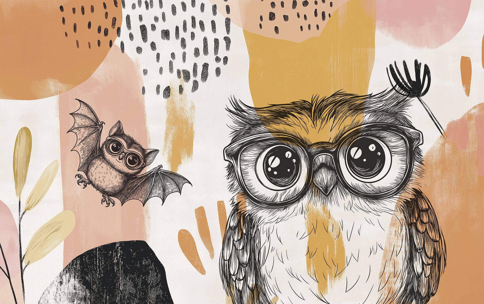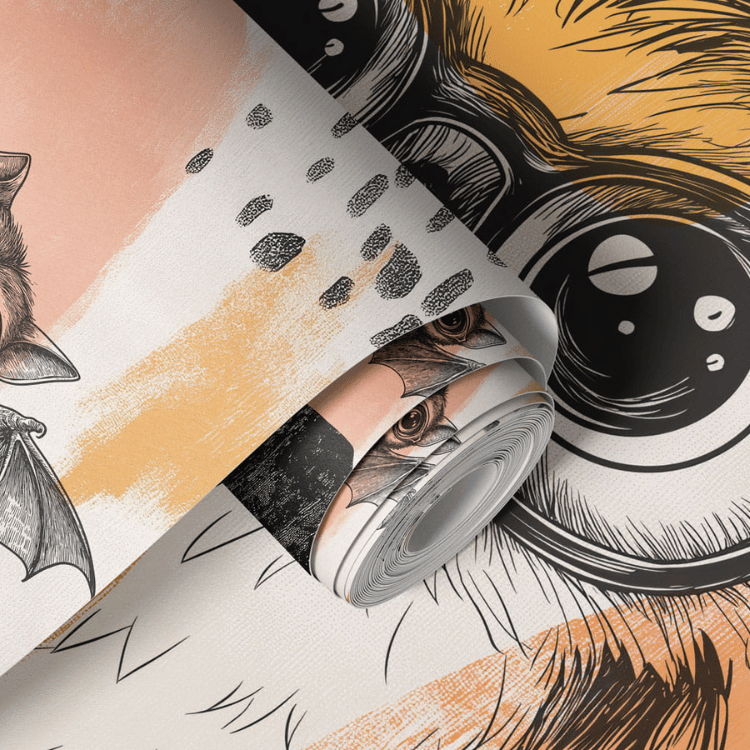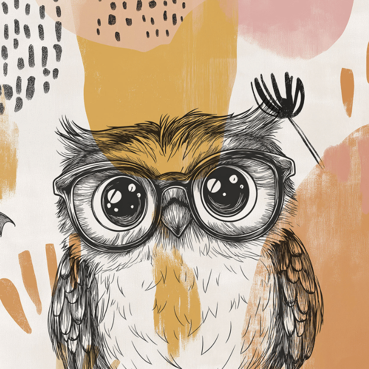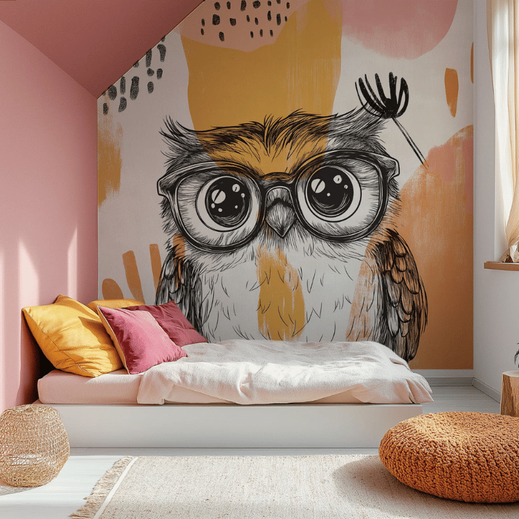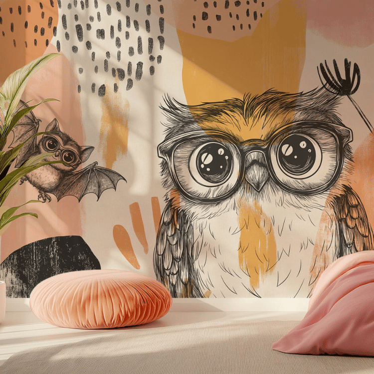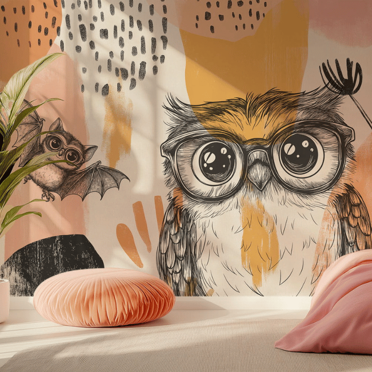 to wyjątkowa propozycja do pokoju dziecka lub nastolatka, która łączy artystyczną swobodę z uroczą, przyjazną ilustracją. Głównym bohaterem tapety jest sowa w dużych, okrągłych okularach – pełna charakteru, ciekawska i nieco zabawna. Towarzyszy jej mały nietoperz, który dodaje kompozycji lekkości i nuty fantazji, zachęcając do tworzenia własnych historii i rozwijania wyobraźni.