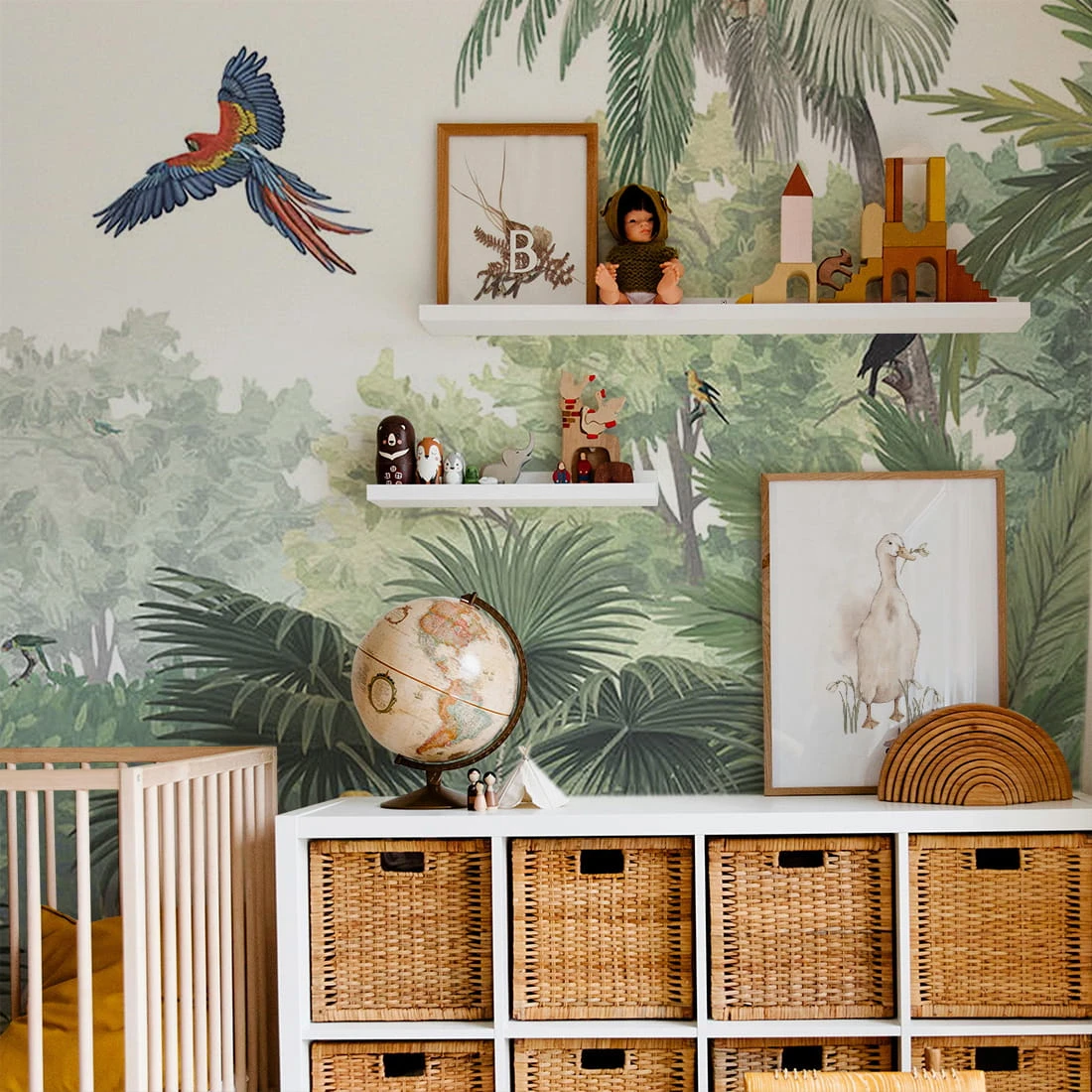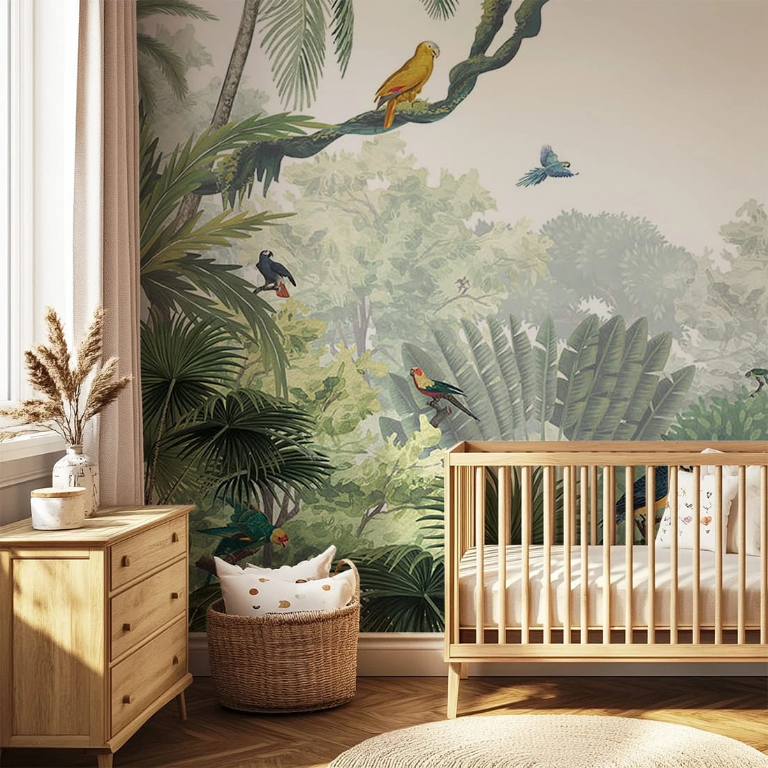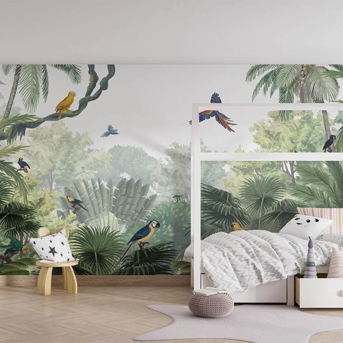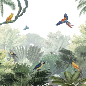 Naturalna, zielona kolorystyka przełamana intensywnymi barwami ptaków tworzy harmonijną, a jednocześnie żywą aranżację. Tło z delikatnie rozmytą roślinnością dodaje głębi i sprawia, że tapeta wygląda jak fragment prawdziwej dżungli.