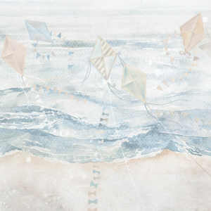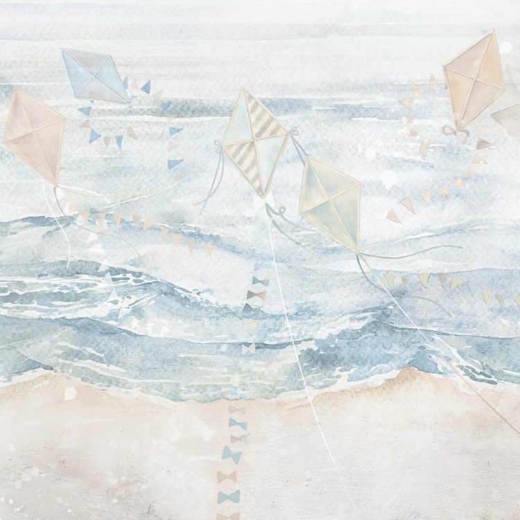 Tapeta do pokoju dziecka przedstawia delikatny i spokojny pejzaż nadmorski z latawcami unoszącymi się nad falami. Utrzymana jest w pastelowych odcieniach błękitu, beżu i szarości, co nadaje jej subtelny i uspokajający charakter. Latawce są różnokolorowe, ozdobione delikatnymi wzorami i ciągną za sobą długie wstęgi z małymi trójkątnymi proporczykami. Tło przedstawia spokojne morze z delikatnie falującymi falami oraz piaszczystą plażę. Całość tworzy lekki i marzycielski nastrój, idealny do dziecięcego pokoju.