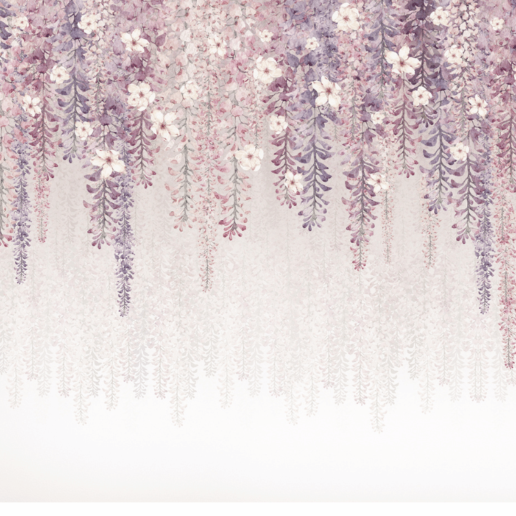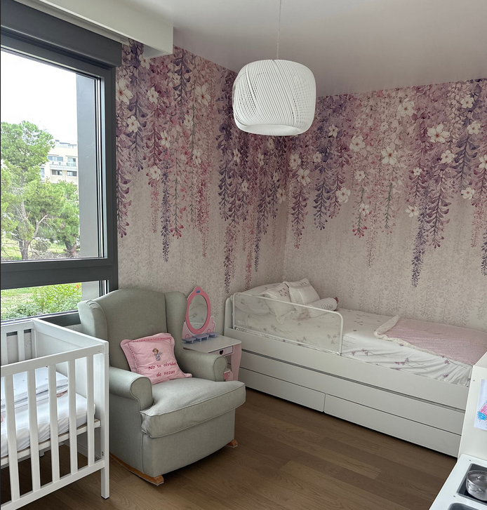 to niezwykła dekoracja ścienna, zaprojektowana z myślą o stworzeniu bajkowej, subtelnej przestrzeni w pokoju dziewczynki. Jej wyjątkowy charakter budują delikatne, akwarelowe motywy kwiatowe inspirowane kwitnącą glicynią, które nadają wnętrzu lekkości, romantyzmu i harmonii. Kwiaty utrzymane są w pastelowych odcieniach różu, fioletu oraz pudrowego beżu, dzięki czemu tapeta wprowadza do pomieszczenia spokojny, ciepły i relaksujący nastrój, sprzyjający odpoczynkowi i zabawie.