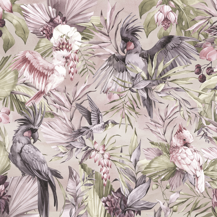 to wyjątkowa dekoracja ścienna, która doskonale sprawdzi się w pokoju dziewczynki, wprowadzając do wnętrza elegancję, delikatność i nutę egzotycznej magii. Jej niezwykły wzór łączy wdzięczne ptaki kakadu z bujną roślinnością i subtelnymi kwiatami, tworząc harmonijną, pełną życia kompozycję. Dominujące odcienie różu, pudrowej lawendy, beżu i przygaszonej zieleni nadają tapecie lekkości oraz romantycznego charakteru.
