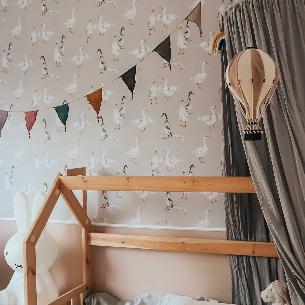 Motyw gęsi i kaczek pobudza dziecięcą wyobraźnię, zachęca do opowiadania historii i zabawy, a jednocześnie zachowuje estetyczną równowagę, tak ważną w przestrzeni do snu i odpoczynku. Tapeta świetnie sprawdzi się na jednej ścianie lub jako spójna baza całej aranżacji, tworząc ciepłe, przytulne i pełne uroku miejsce dla dziecka.