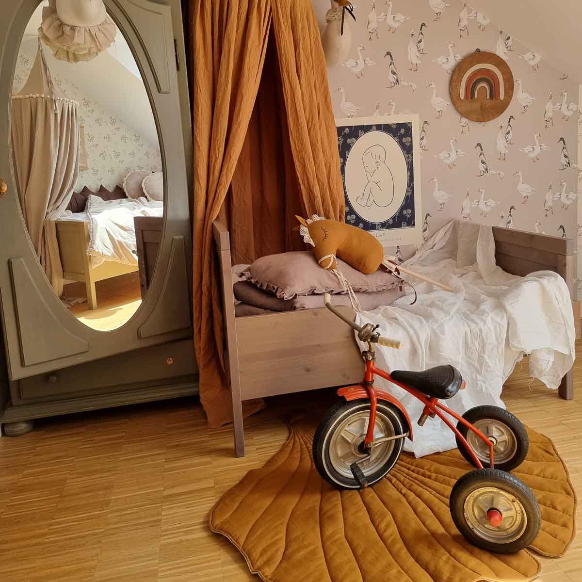 Tapeta doskonale współgra z naturalnym drewnem, lnianymi tkaninami oraz dodatkami w stylu vintage i boho. Baldachim nad łóżkiem, girlandy z proporczyków czy wiklinowe kosze pięknie podkreślają jej bajkowy, ale nienachalny klimat. To idealny wybór zarówno do pokoju niemowlęcia, jak i starszego dziecka – wzór jest ponadczasowy i „rośnie” razem z wnętrzem.