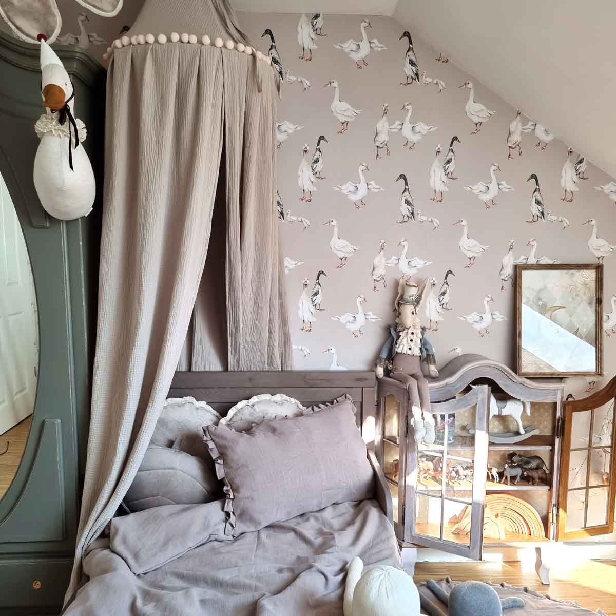 Ta tapeta w delikatne gęsi i kaczki przenosi dziecięcy pokój w spokojny, sielski świat inspirowany naturą i wiejską idyllą. Subtelne ilustracje ptaków, utrzymane w miękkich odcieniach beżu, złamanej bieli i przygaszonej zieleni, tworzą harmonijne tło sprzyjające wyciszeniu i poczuciu bezpieczeństwa. Wzór jest lekki i rytmiczny, dzięki czemu nie przytłacza wnętrza, a jednocześnie nadaje mu wyjątkowego charakteru.